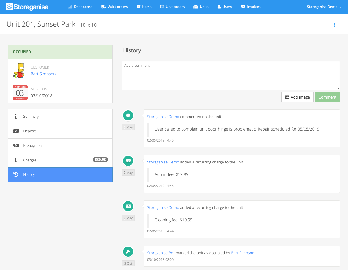 Each unit has a detailed history section to view the full audit history of all unit activities.You can manually add comments and images, which will be logged with the latest action/comment at the top of the list.
