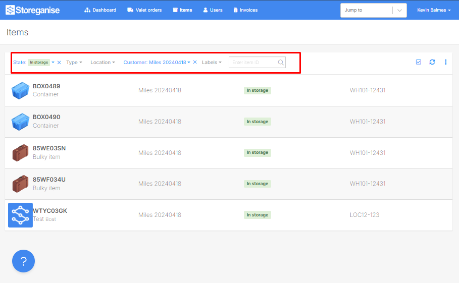 Data can be filtered according to these filters:- State: Can be any of the following: In storage; In transit (to storage); In transit (to customer); With customer; or Unassigned. Unassigned items are empty boxes that can be used to assign to new valet orders/customers.