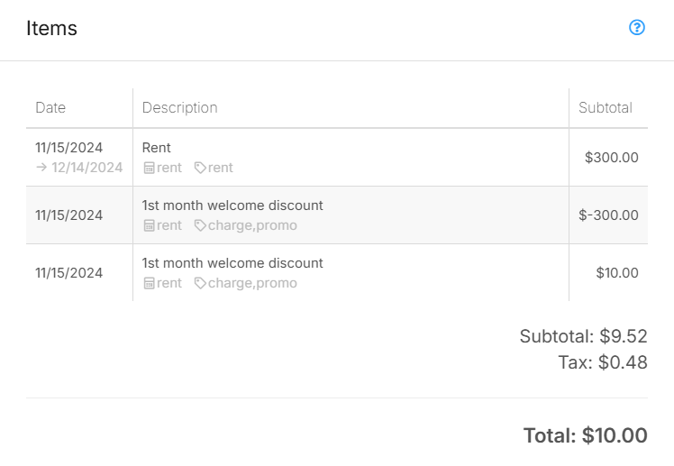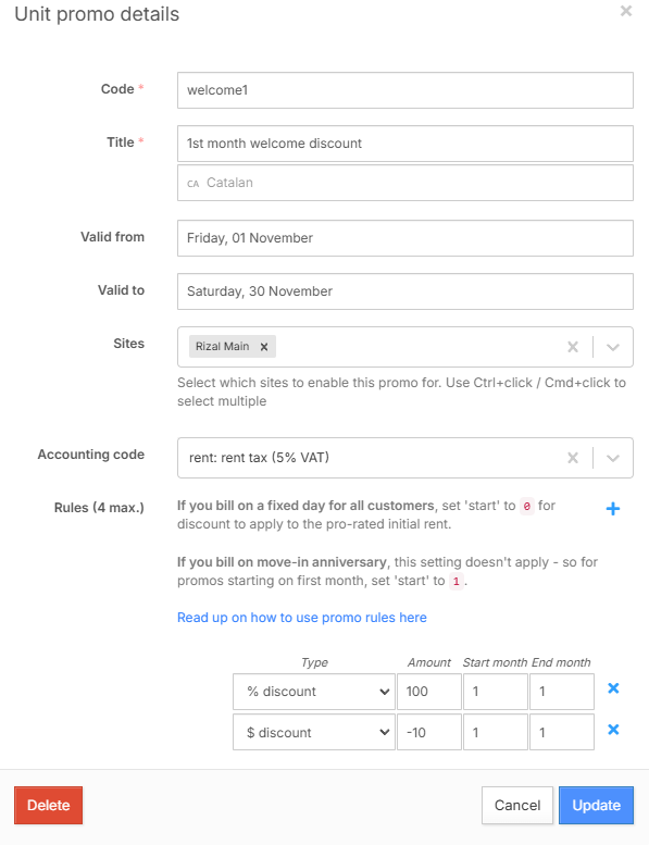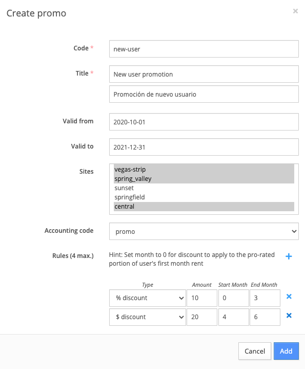 You can add up to 4 discount rules to apply to each promo code. Choose from a % discount or a $ discount (or a combination of both).The Start month and End month refer to the months of rental to which the discount should apply. If you want the discount to apply to the first partial month for a user moving in the middle of the billing period, set the Start month to 0.