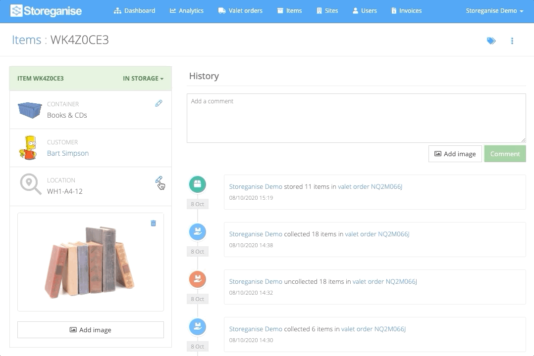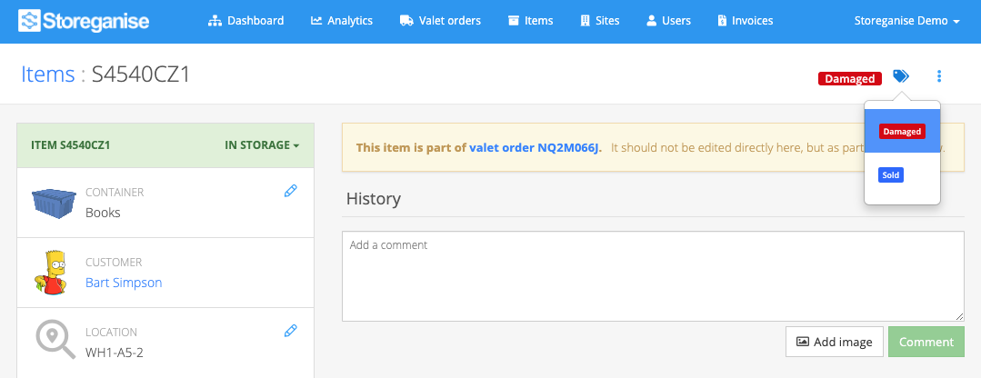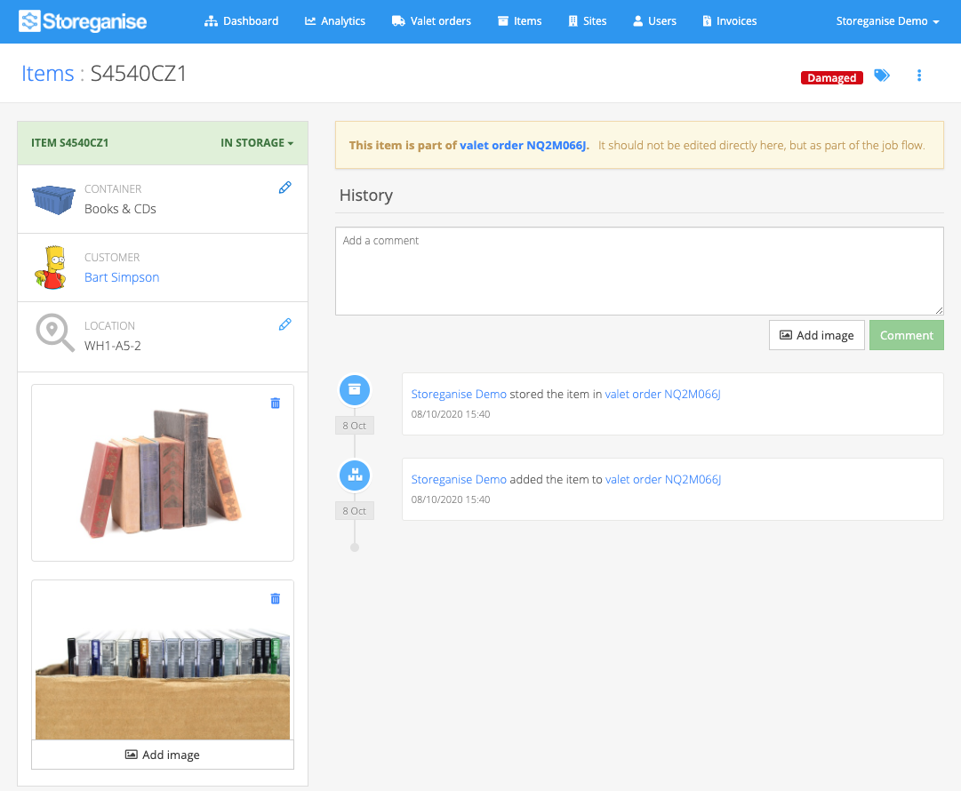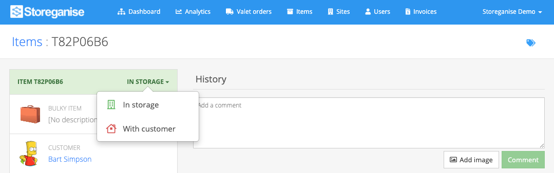 Each item has a page showing all details for the item including item type, state, location, owner and item title. The History section at the bottom shows the full history of any change in state, title, owner, location or image associated with a particular item. You can add comments or images to the history log from this section too.