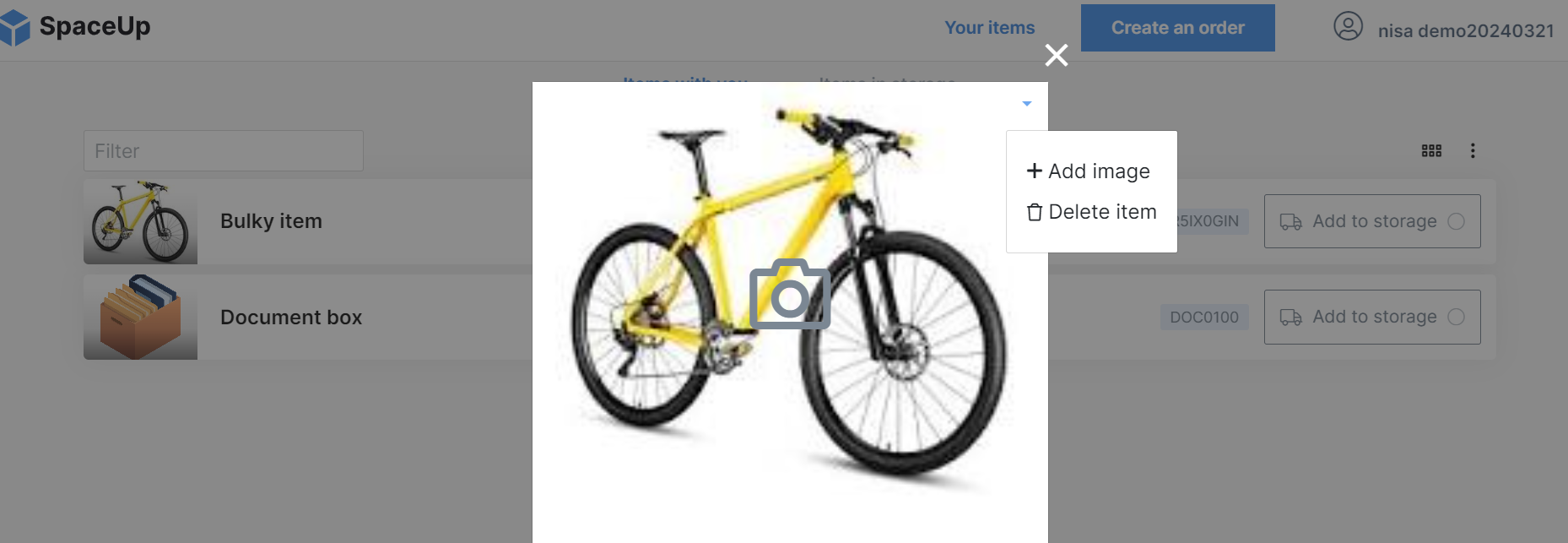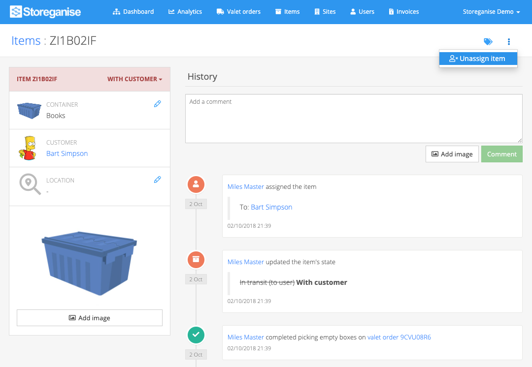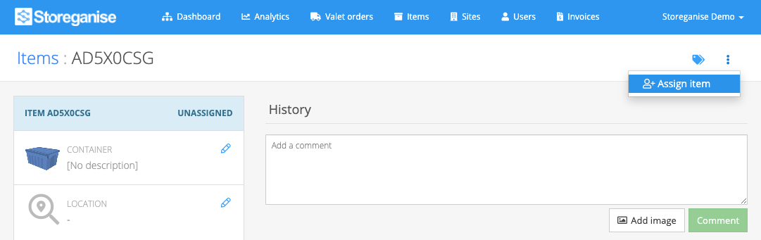 To unassign an item from a user, click on the ⠇icon on the top right of the page and select Unassign item. Only boxes can be unassigned. Bulky items cannot be unassigned as they cannot be in an "empty" state but rather always need to be assigned to a user in the system. Read below on how to delete a bulky item if needed.Note: As per the warning, unassigning items removes the item's title, descriptions and images. While the item can be assigned back to a user if it was changed incorrectly, the removal of the images, title and descriptions cannot be undone.