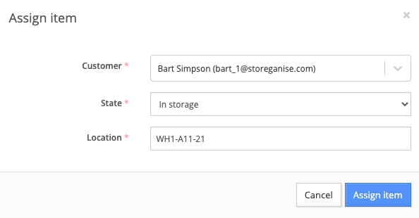In the pop-up, you can choose the user from the user search and set the state as In storage or With user. If setting to In storage, a location ID must be entered too. Only unassigned items will have the option to "Assign" it to a user.