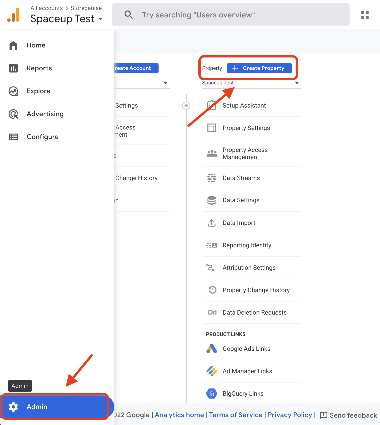 Create a Google Analytics 4 property and Data StreamFirst, you have to upgrade your existing GA property to GA4 or create a new GA4 property. To create a new GA4 property go to the Admin section of your Google Analytics account by clicking Admin in the bottom left corner and then click Create Property in the Property section.