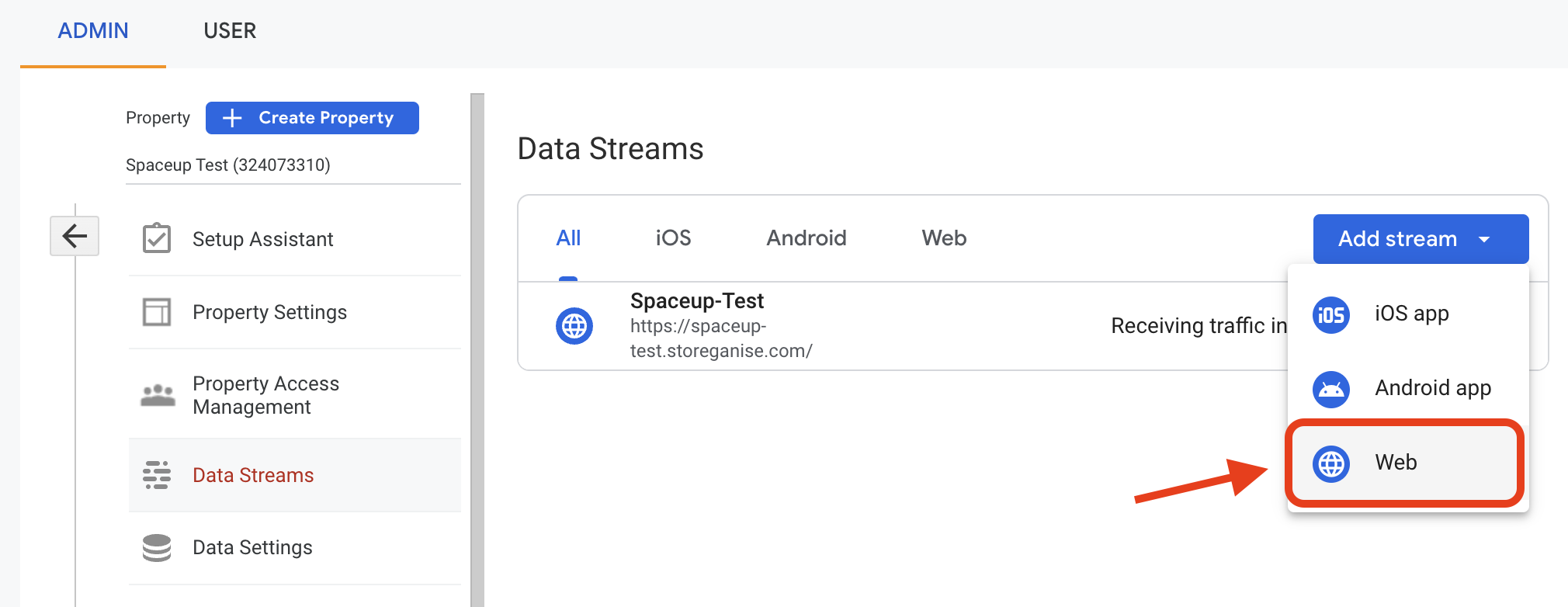 The data stream is a data source from which events are sent to your GA4 property.Under Data Streams click Add stream and choose to create a new Web data stream.
