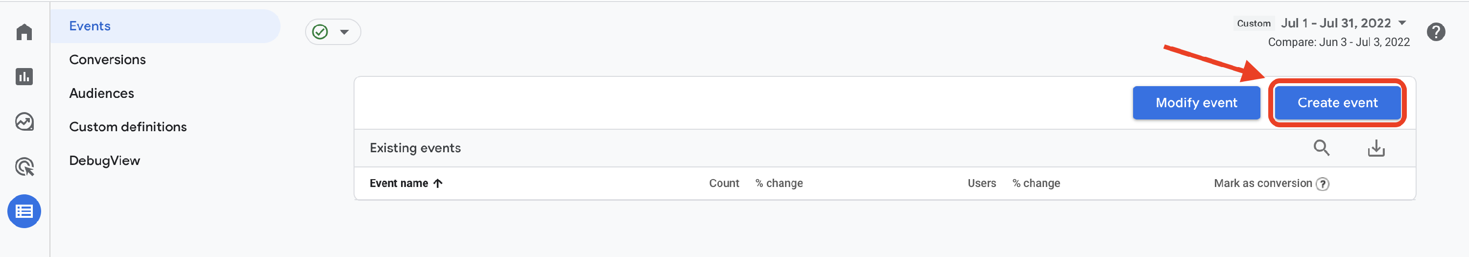 With GA4 connected, you can monitor website traffic and user behavior. Add custom events to create funnels and track specific events on your Storeganise Customer Portal. To create a new custom event, log in to GA, select your GA4 property, and click on Configure in the left navigation menu. Then click on the Create event button.