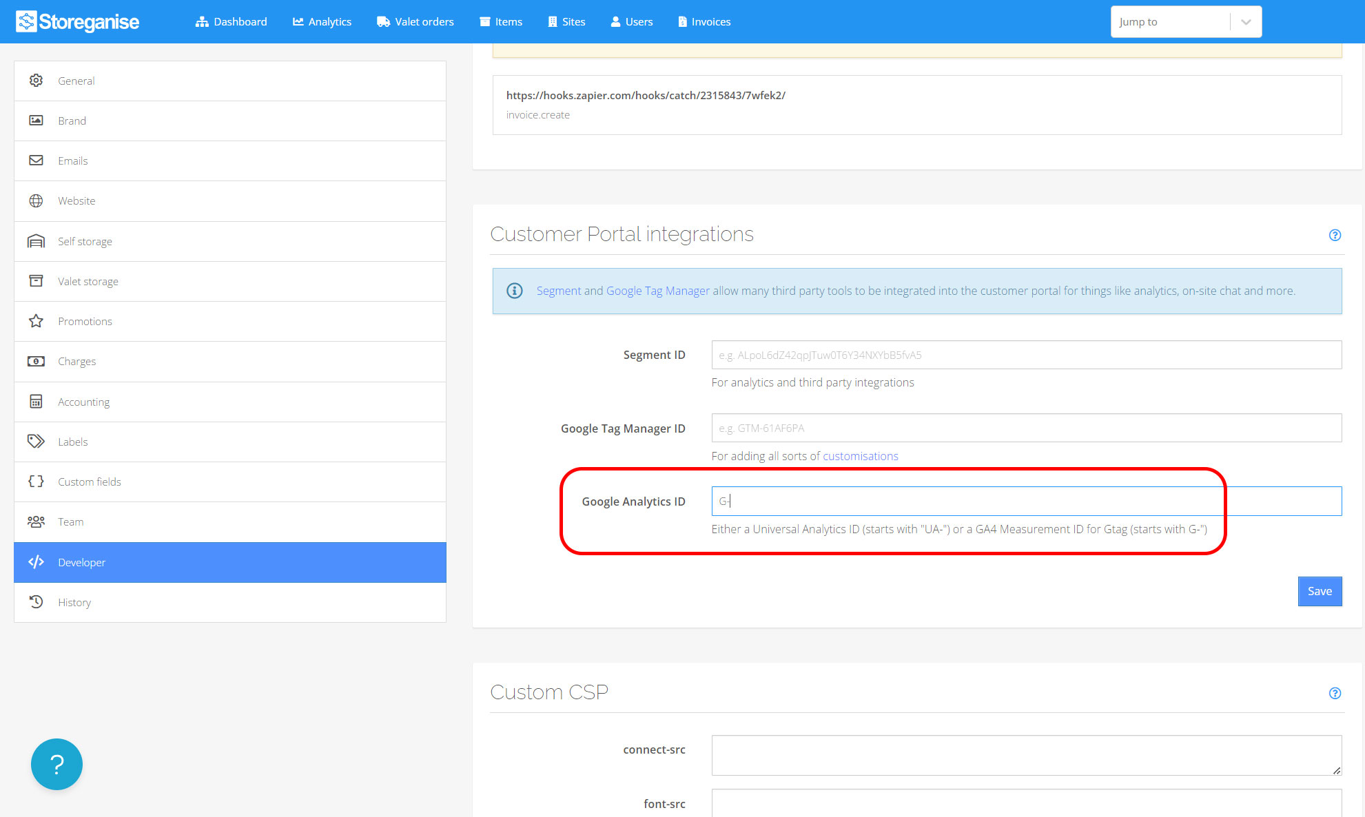 Log in to your Storeganise account. Click on your name in the top right corner and select Main Settings.Open the Developer tab in the left menu and scroll down to Customer Portal Integrations where you will see an option to add a Google Analytics ID. Paste your Google Analytics 4 Measurement ID here and click Save.