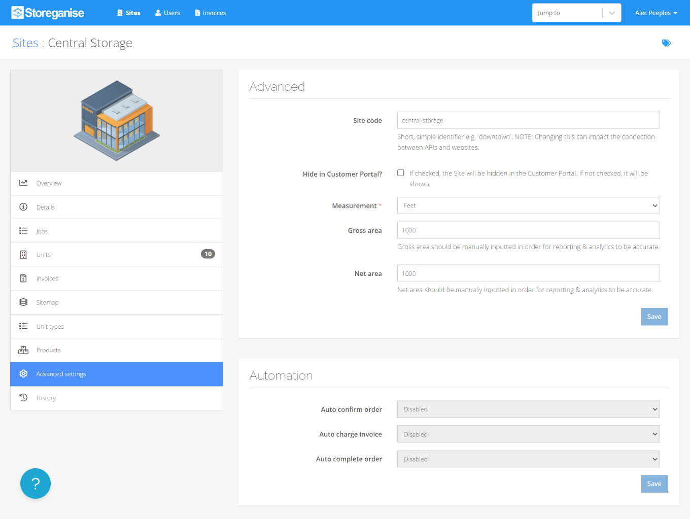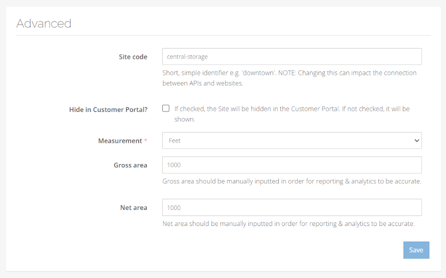 • Site code: The identifier used to reference the site through Storeganise and the API. Changing this can impact the connection between APIs and websites.