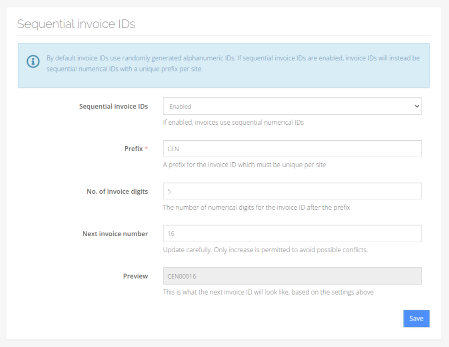 By default, invoice IDs use randomly generated alphanumeric IDs. If sequential invoice IDs are enabled, invoice IDs will instead be sequential numerical IDs with a unique prefix per site.