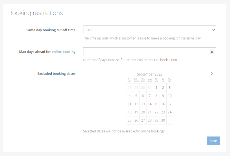 • Max days ahead for online booking: Number of days in advance for a customer can book a unit