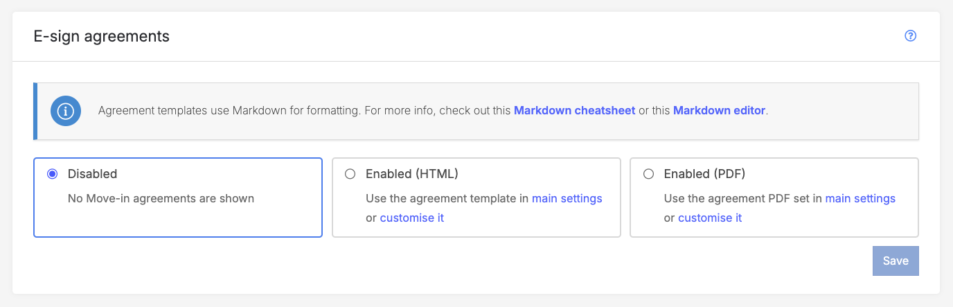 Customize your site's rental agreement.Note: Enabling an e-sign agreement here will overwrite the universal agreement in the main settings.