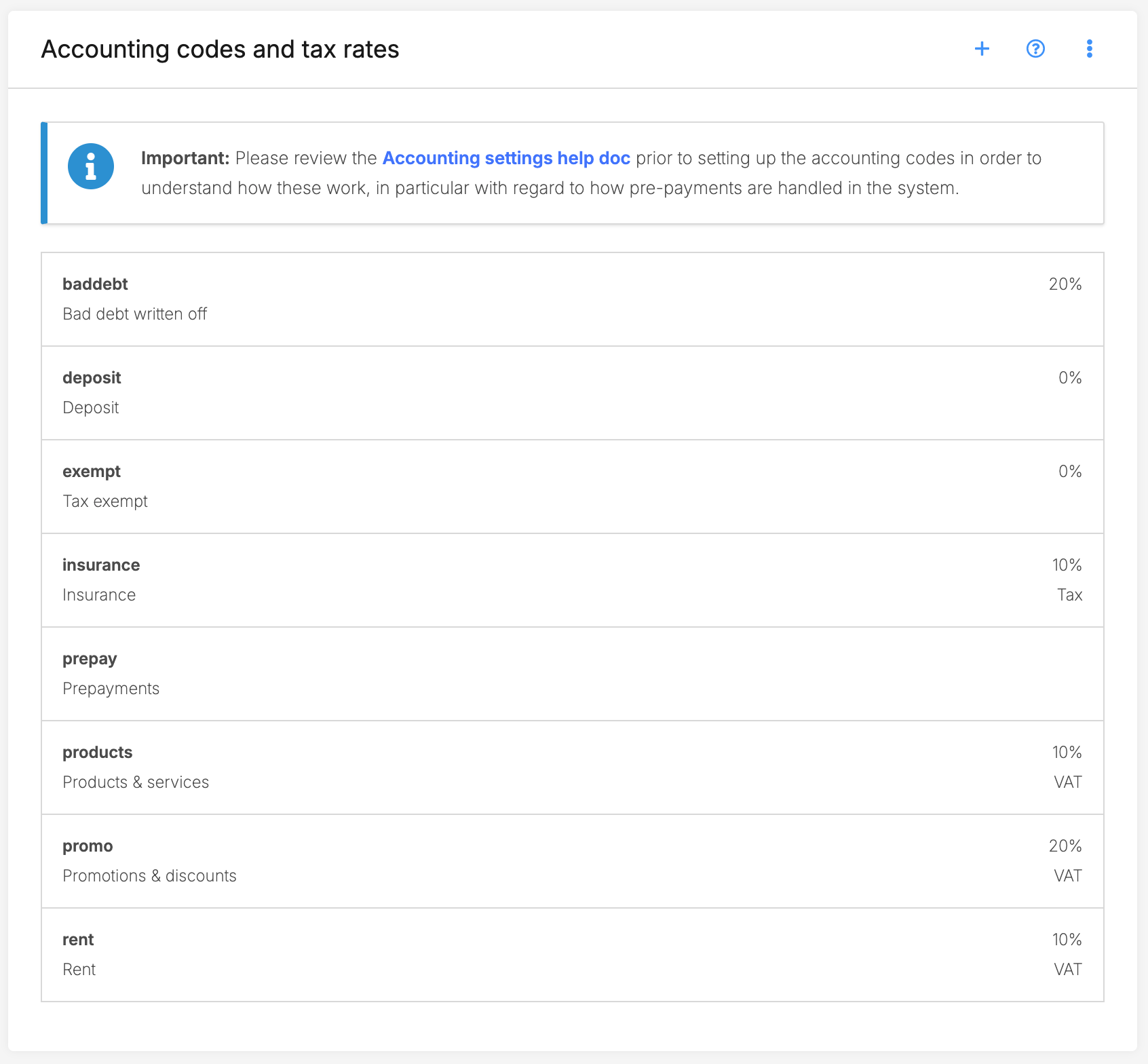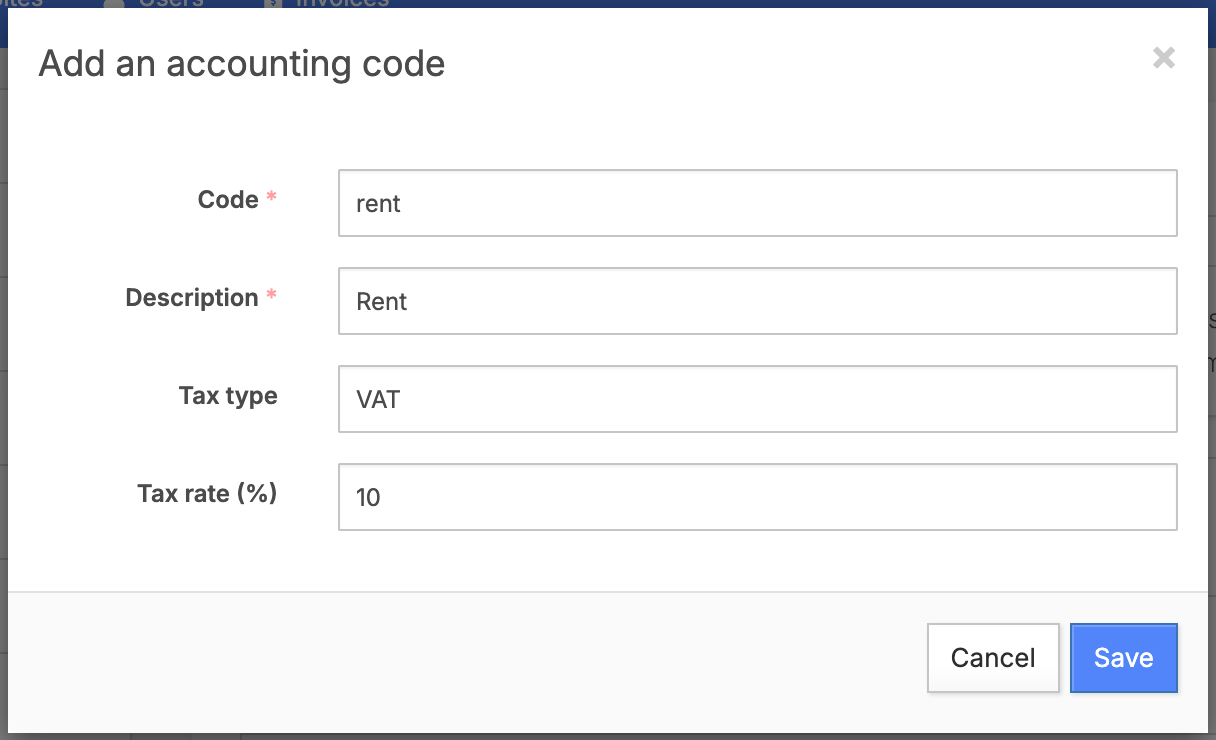 - Tax rate (%): Enter the tax rate amount as a percentage that should be applied to invoice items associated with this accounting code.