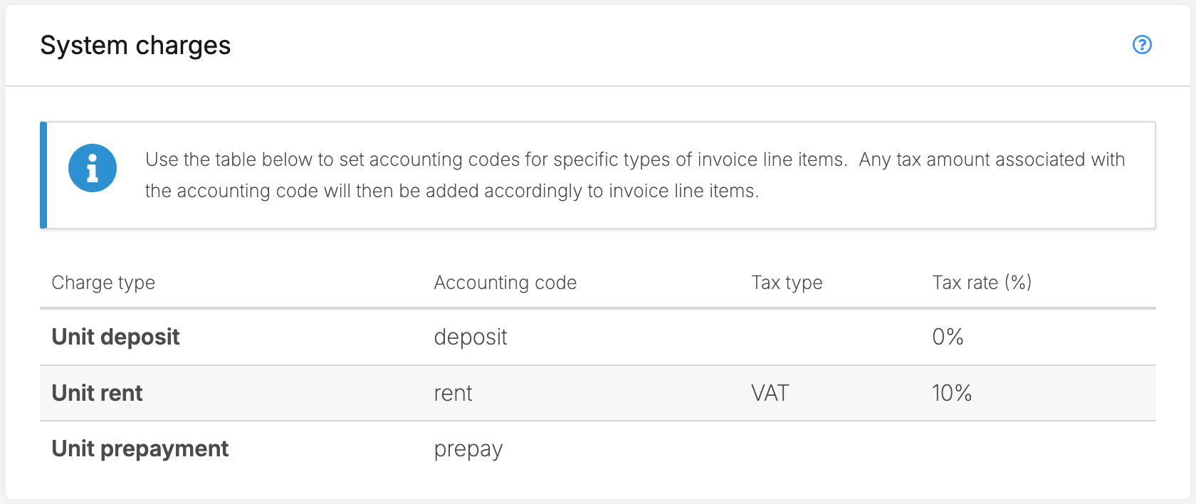 Click on a charge type and in the modal select the accounting code (and consequently the corresponding tax type and tax rate) to be applied to that respective charge type.