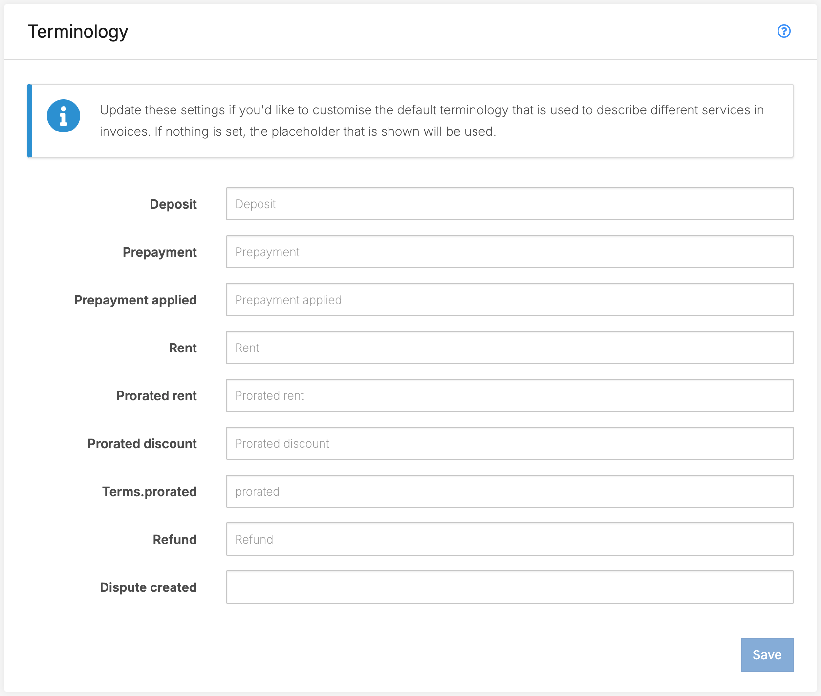 This section allows you to customize the default terminology that is used to describe different services in invoice line item titles. If nothing is set, the placeholder that is shown will be used.