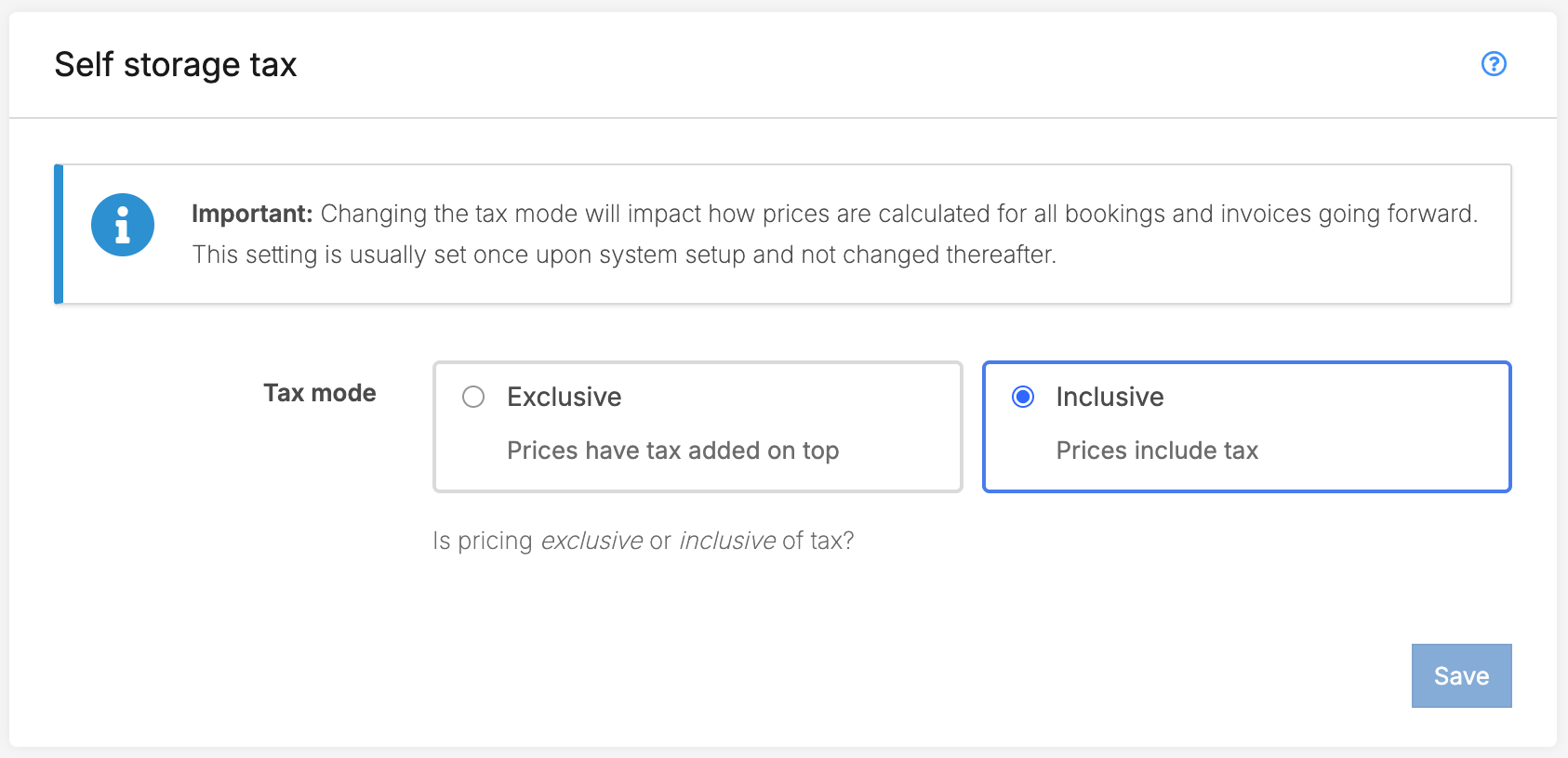 The self storage tax section allows you to configure tax settings. Decide between inclusive or exclusive models to align with your business preferences. These settings apply to all invoicing activity across your account.
