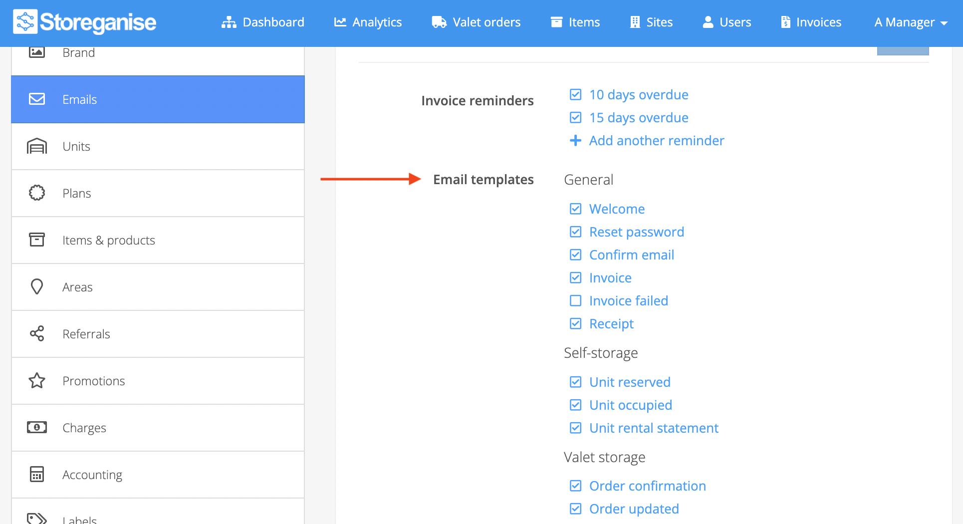 There are a few emails that are sent out by Storeganise, such as: