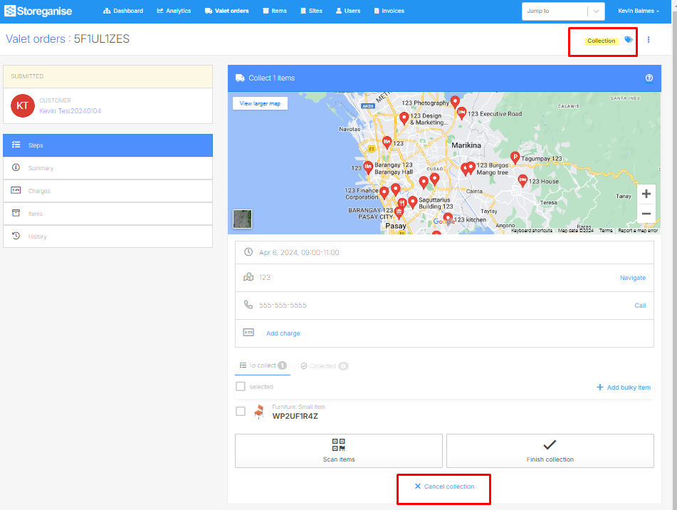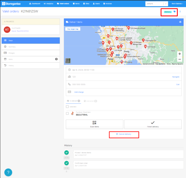 When a valet order is submitted, it is added to the upcoming jobs list. It can be updated to add/remove items or fix submission errors. It's best to confirm/start the order only when you're about to start working on it (e.g. picking items).Once 'Start order' is clicked, it cannot be cancelled, and some elements can't be updated anymore. This is a security measure to prevent losing items that have already been added to the order. You can still complete the order by following the guide below.Just skip steps when possible. Click 'Finish delivery'/'Finish collection' for most steps without marking items as delivered/collected.Also, remember that whatever happens during an order, the final put-away step allows you to set the correct state of each item, whether it is in storage or with the customer.Below we'll go through examples for different types of jobs: