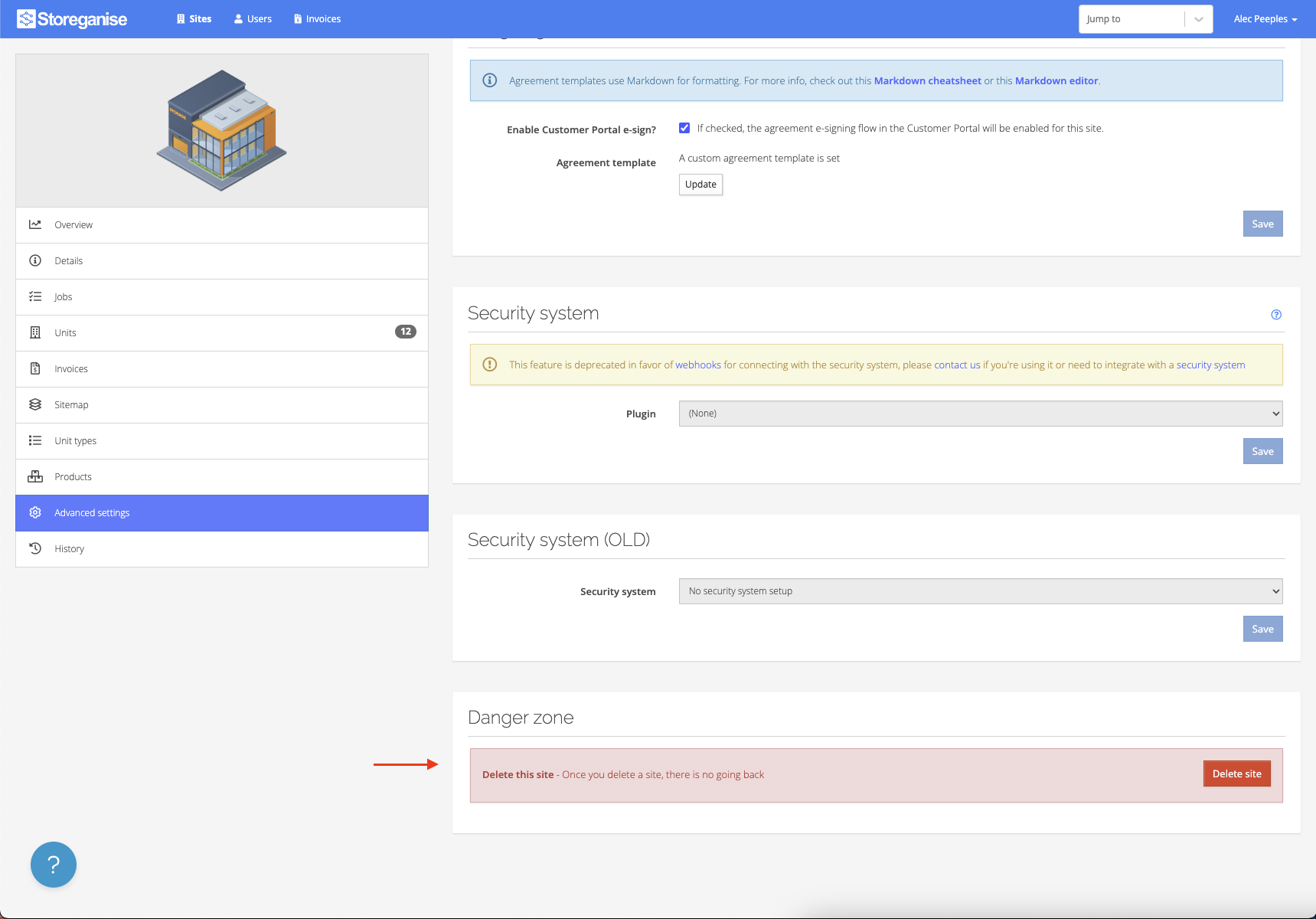 There may be a situation where you need to delete a site from Storeganise. Please consider this action carefully as it is permanent and data cannot be recovered once deleted.