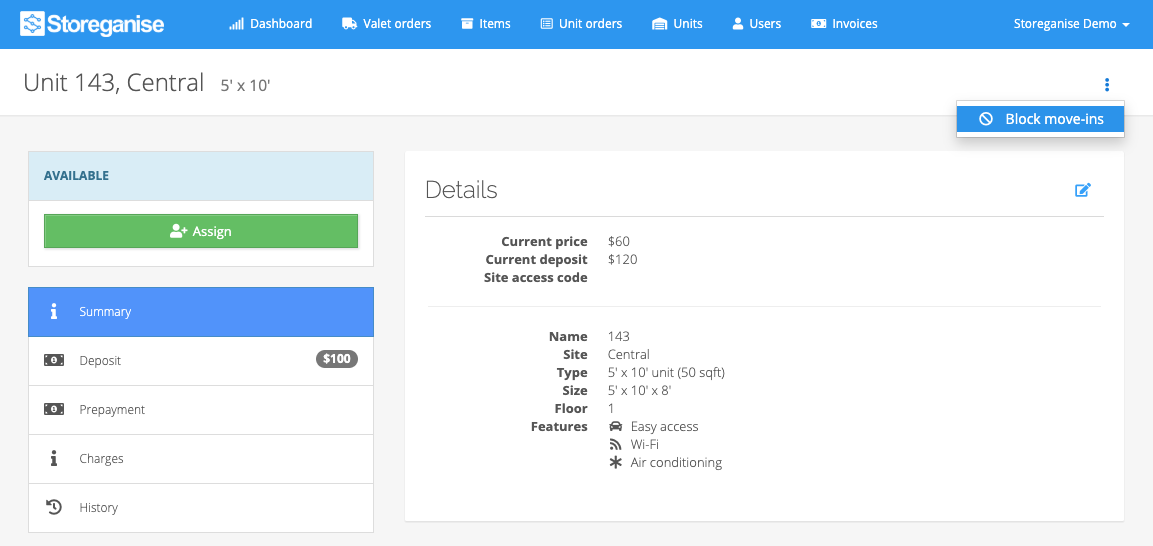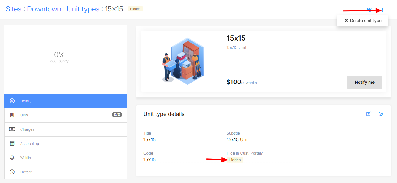 Unit types in Storeganise can only be deleted if there are no units associated with them. Once confirmed, you can follow the steps below to delete a unit type: