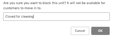 3. Select 'Block move-ins' and enter a reason why you are going to archive the unit, e.g. 'no longer in use'