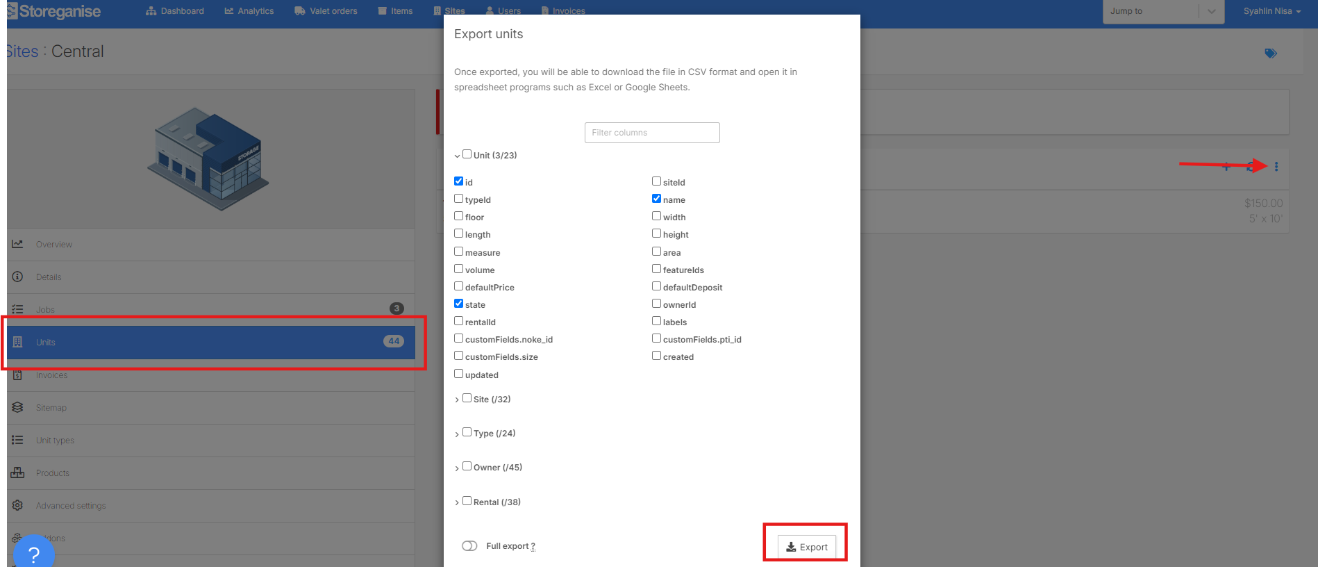 3. Click on ⁝ and select export, tick the necessary data points (id, name,state)