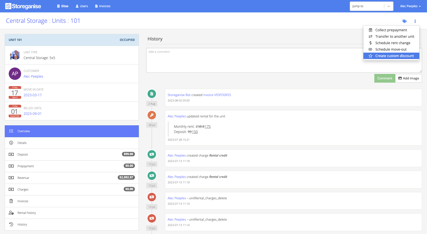 To create a custom discount using the promotion code settings (allowing for a % discount for a fixed amount discount or any combination thereof) navigate to a unit rental page, click on the three dots, and then choose 'Create custom discount.'
