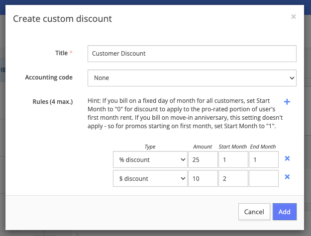 a Start Month and End Month. The start month is linked to the next invoice. For example, '1' applies to the next invoice, '2' to the second, and so on.Here is a discount: 25% off the next invoice and a $10 discount on the second invoice. If no End Monthis specified, the second rule is an ongoing discount for all future invoices (starting with the second).