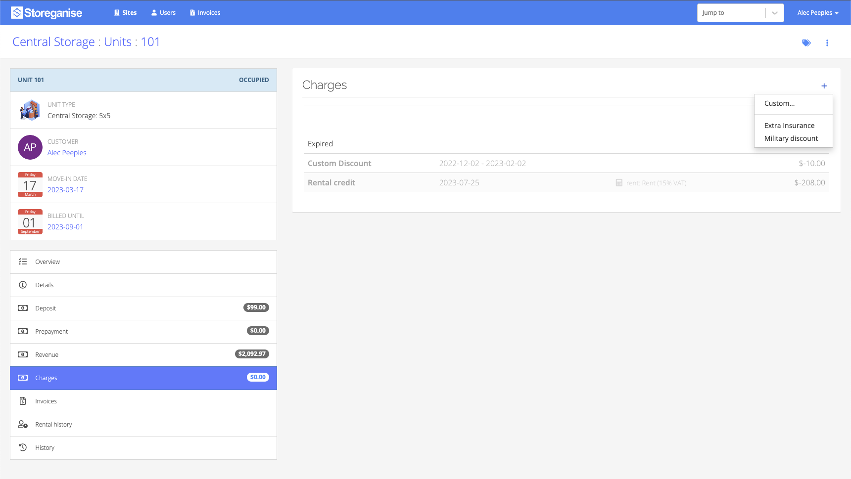 You may also apply a custom charge (a negative charge in the case of a discount) directly to the 'Charges' section of a unit rental account.First, click on the + icon. From here you may choose from predefined system charges or create a one-time custom charge.