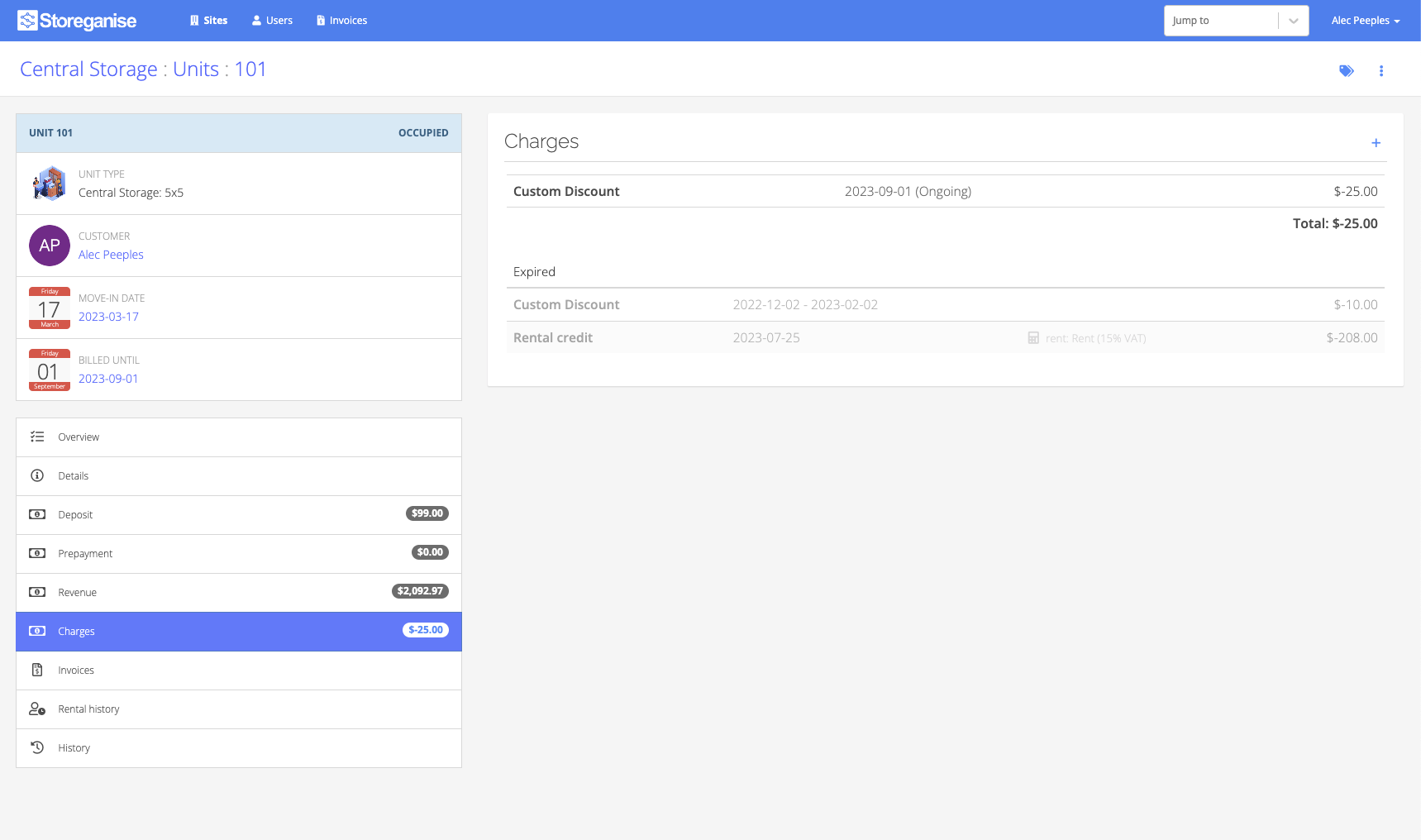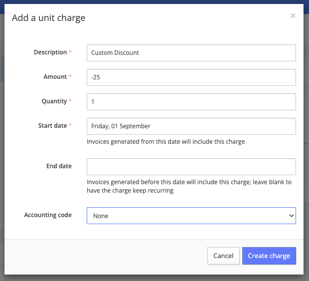 Two options for applying a discount to a unit rental account: charges and promotions. Configure discounts for future or existing invoices (in draft state). Adding a discount to a unit rental account will apply it to future invoices. For invoices in draft state, apply discount directly.For further information on pre-defined charges, review our Charges settings document.