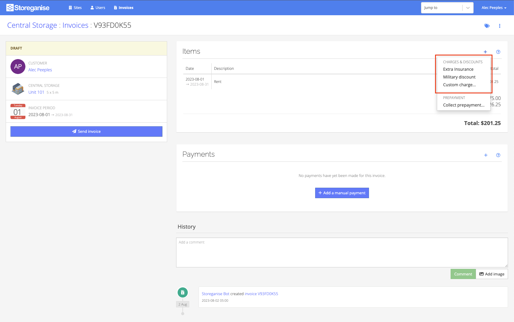 To create a discount on an existing invoice, it must first be set to the Draft state.With a draft invoice, choose the + icon. Here you will see a section populated by any predefined system charges as well as the option to add a custom charge.