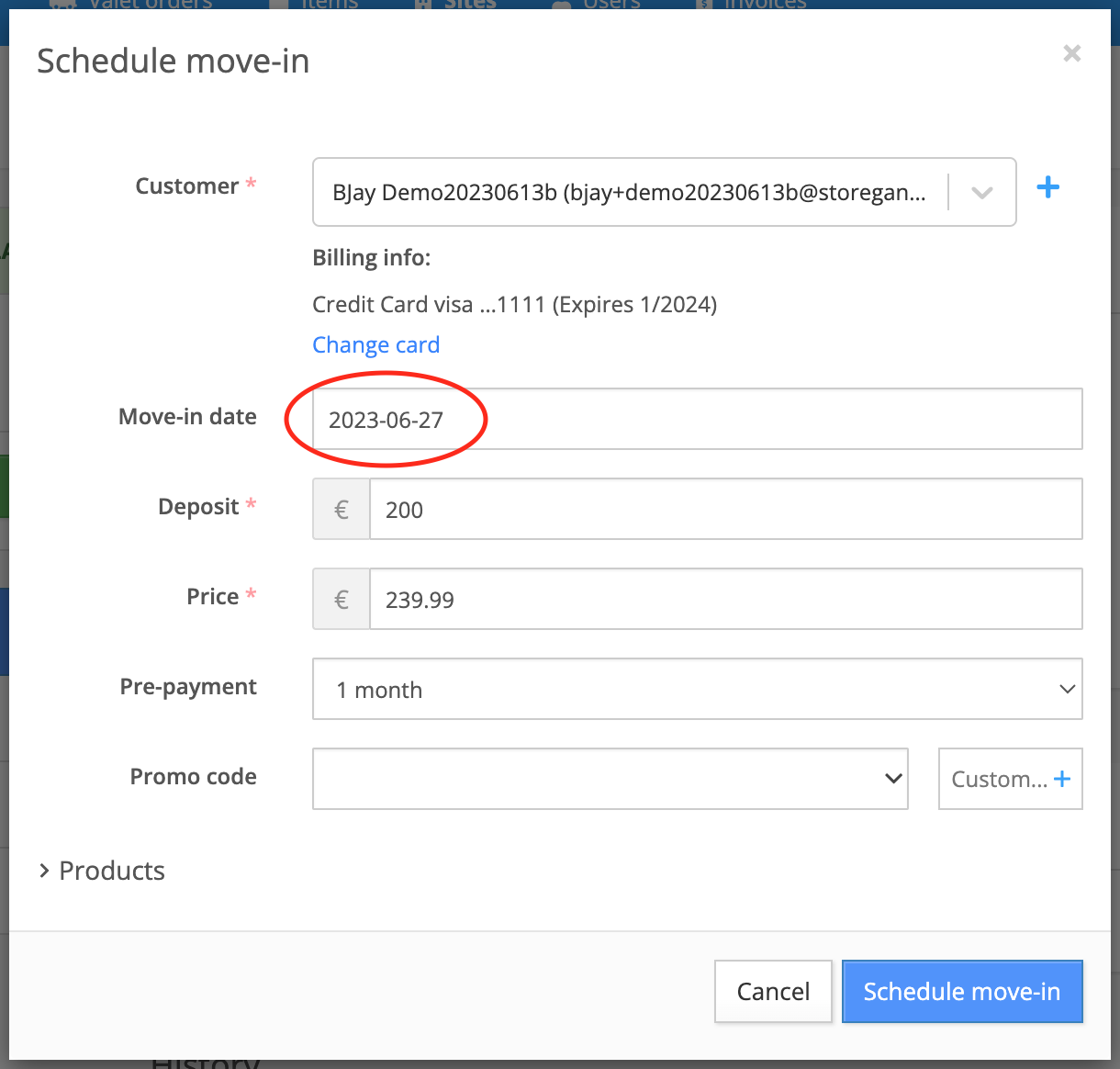 1. When attempting to schedule the second move-in, simply change the Move-in date one day ahead, then click Schedule move-in. This will create the move-in job.