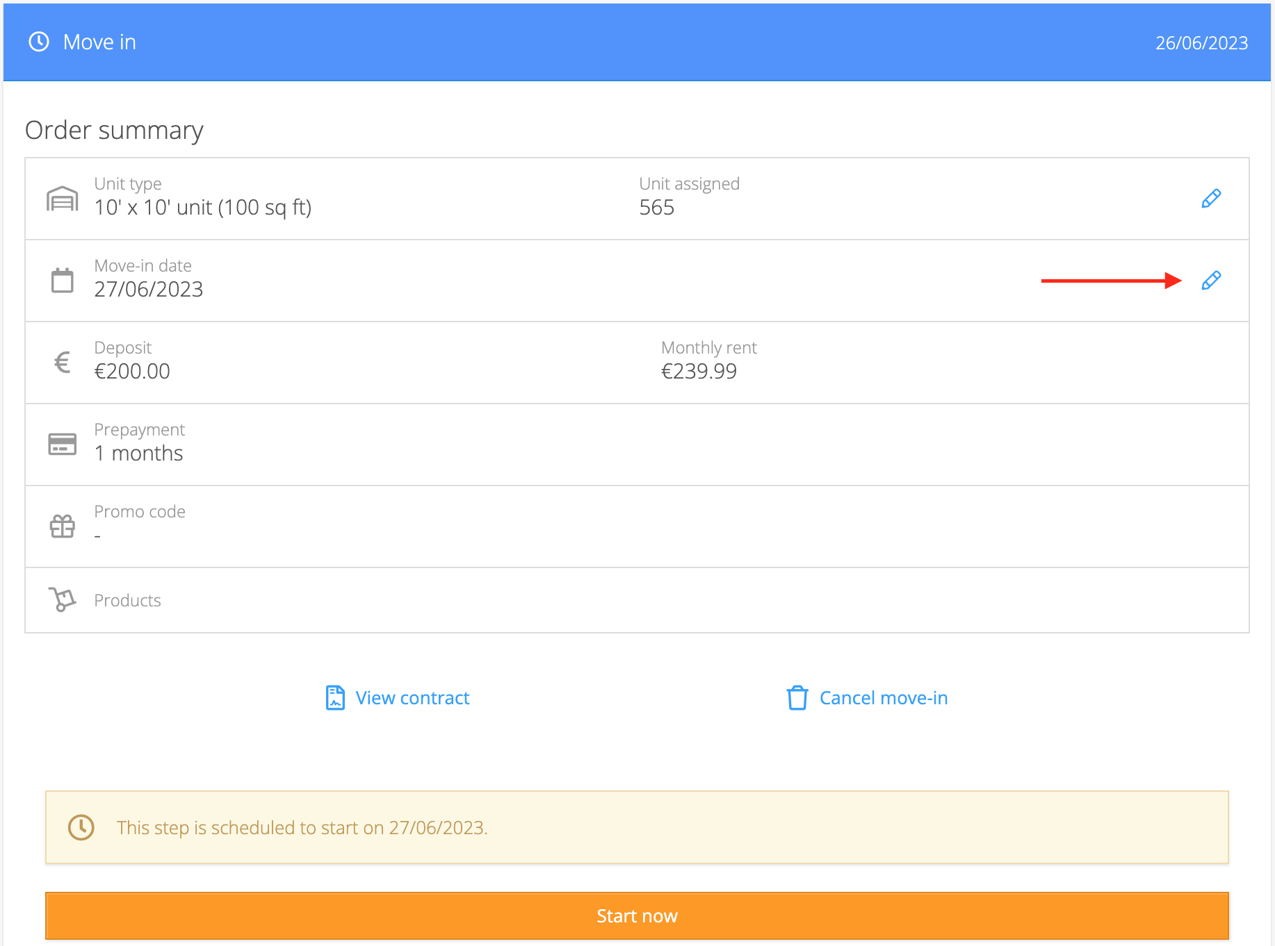 1. After clicking Schedule move-in, the system will display the order summary for this job. Click the pencil icon for the Move-in date line.