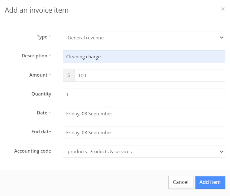 - Click on the "+" icon to add a charge or a discount from the list or create a custom charge.