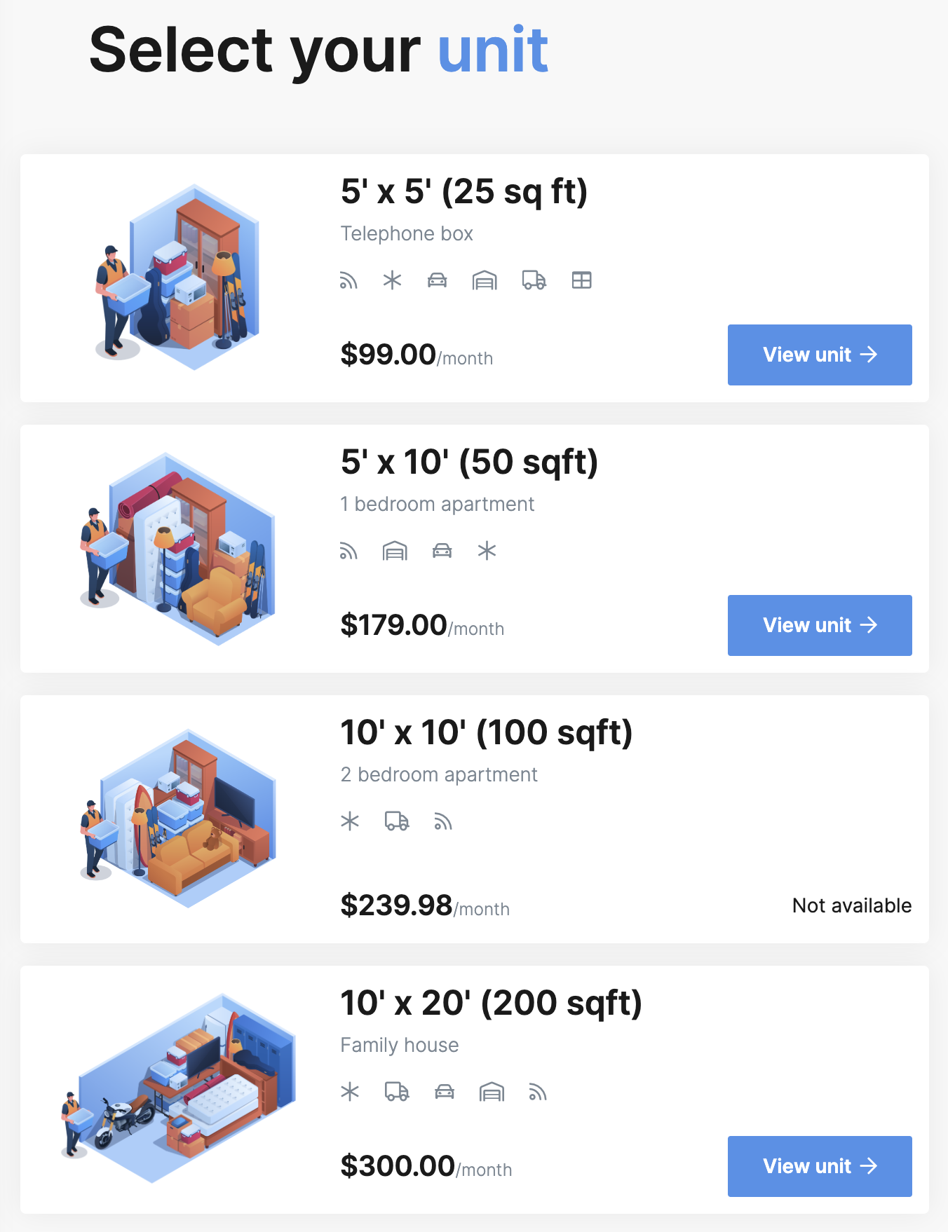 It is recommended to utilize a different image for each unit type you offer. There is a clearer distinction between the size options when your customers are browsing, and it provides some visual variety in your booking portal.