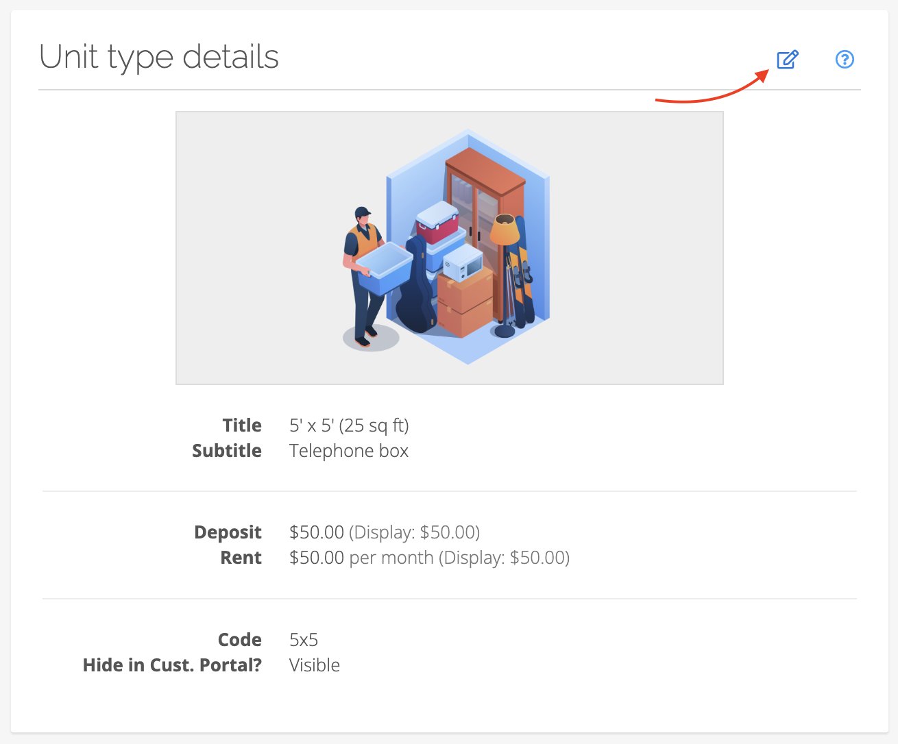 To upload an image for a unit type, first navigate to your Sites settings and click on the Unit types tab on the lefthand side. Here you will see a list of all unit types in your account. Click on the specific unit type you wish to change the image for, then click the pencil icon in the Unit type details section.