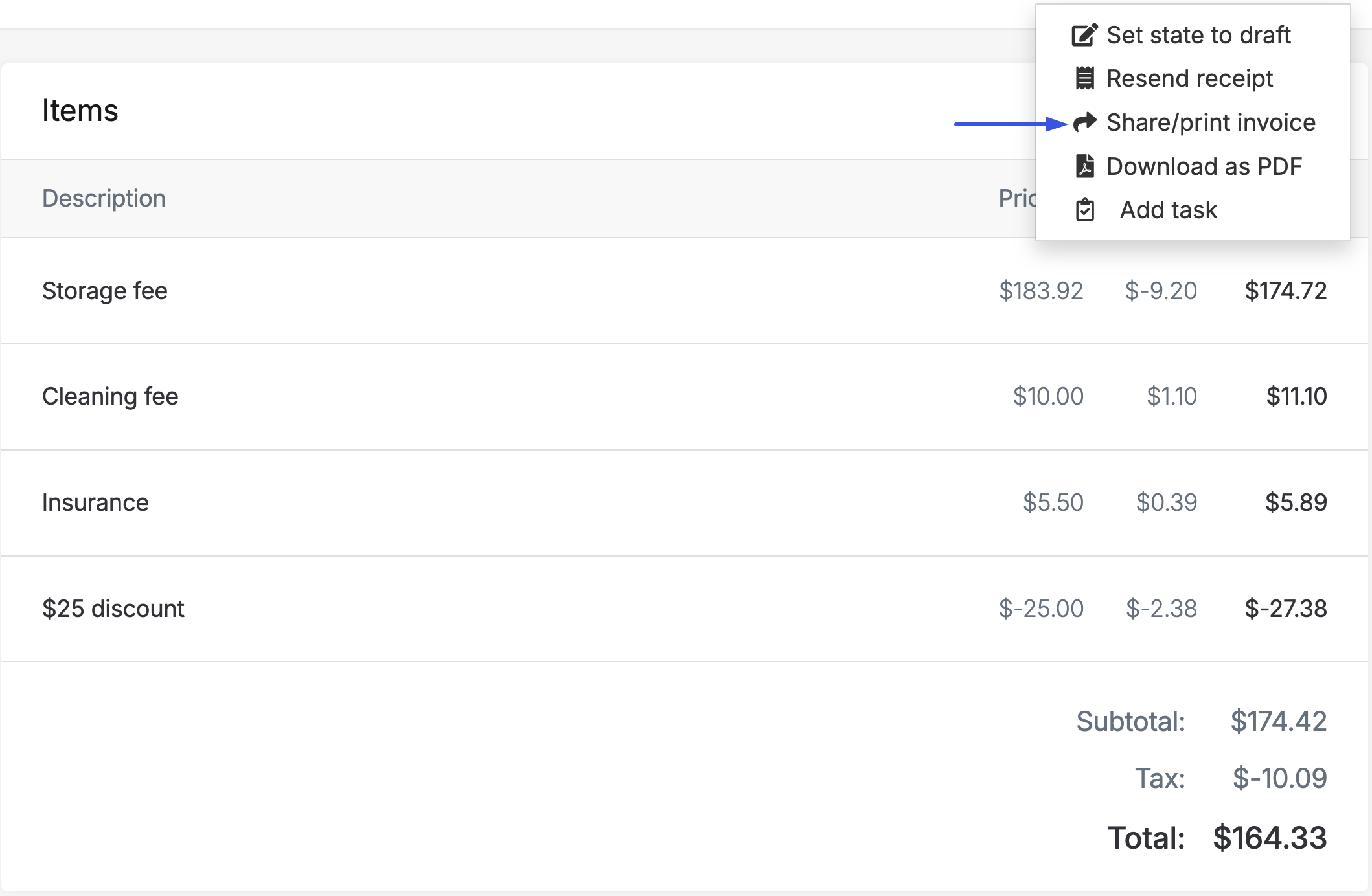 If you want to print an invoice or share a link to the invoice, click on the ⋮ icon on the top right of the page and select Share/print invoice.