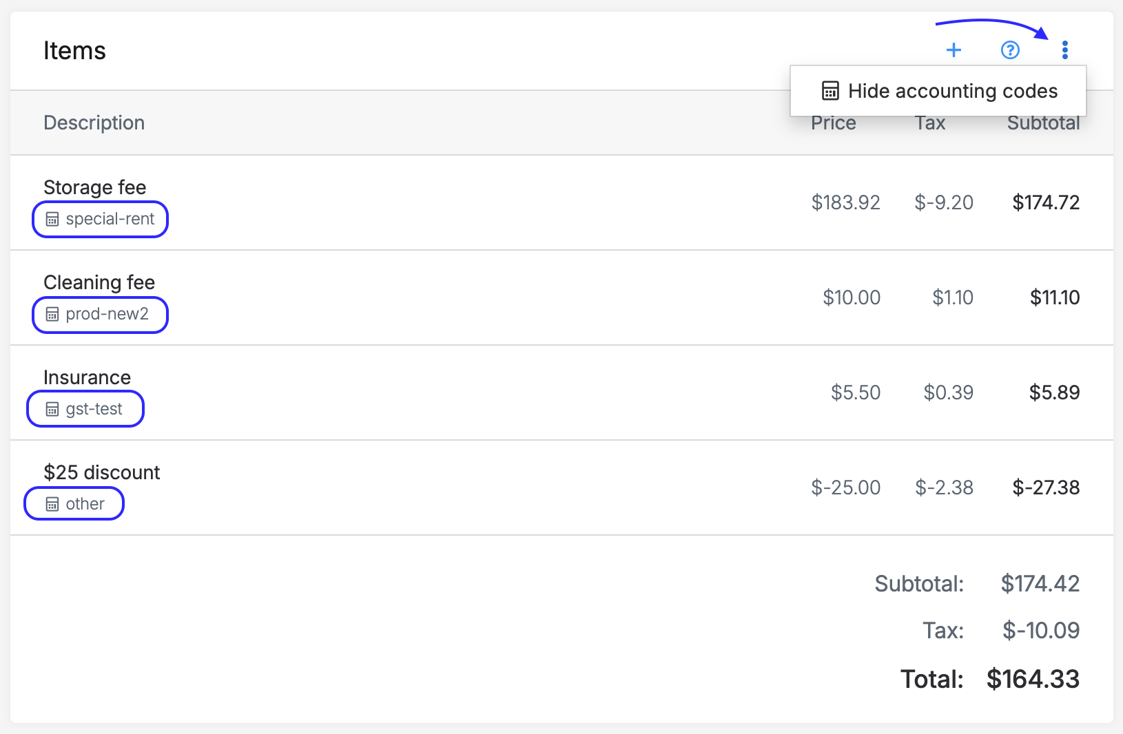 Accounting codes are no longer displayed directly on invoices by default. To view them, open the options menu (⋯) in the top-right corner of the invoice preview, then select Show accounting codes.