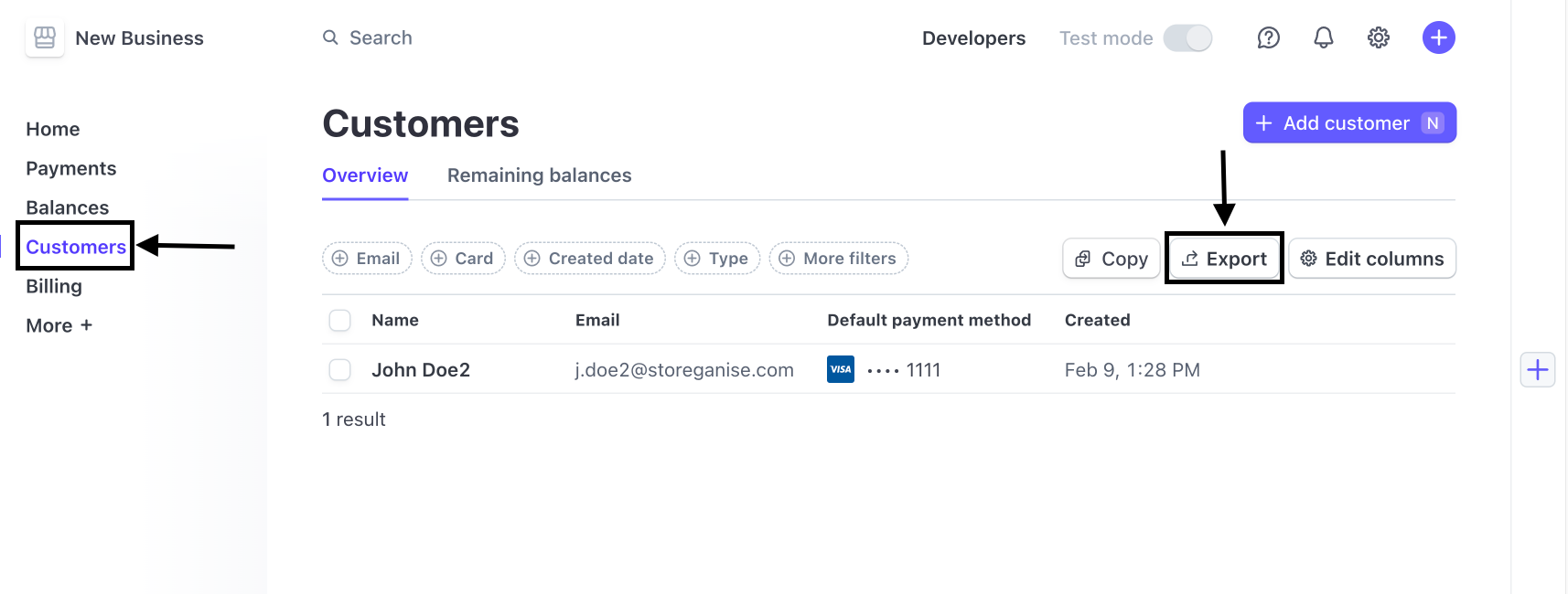 - Utilize the "Export" feature to download your customer list, which will be saved as a CSV file. This file contains Customer IDs that will be imported into Storeganis