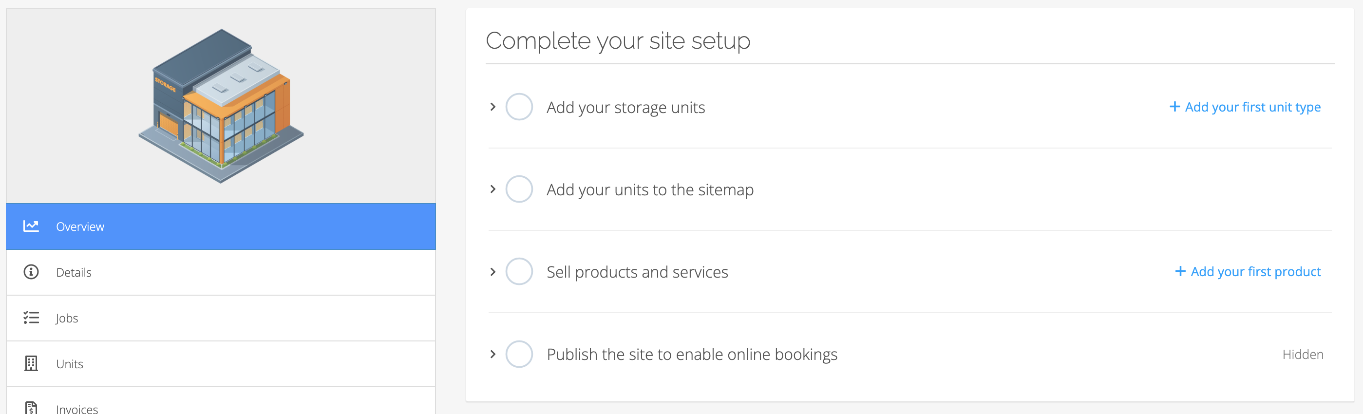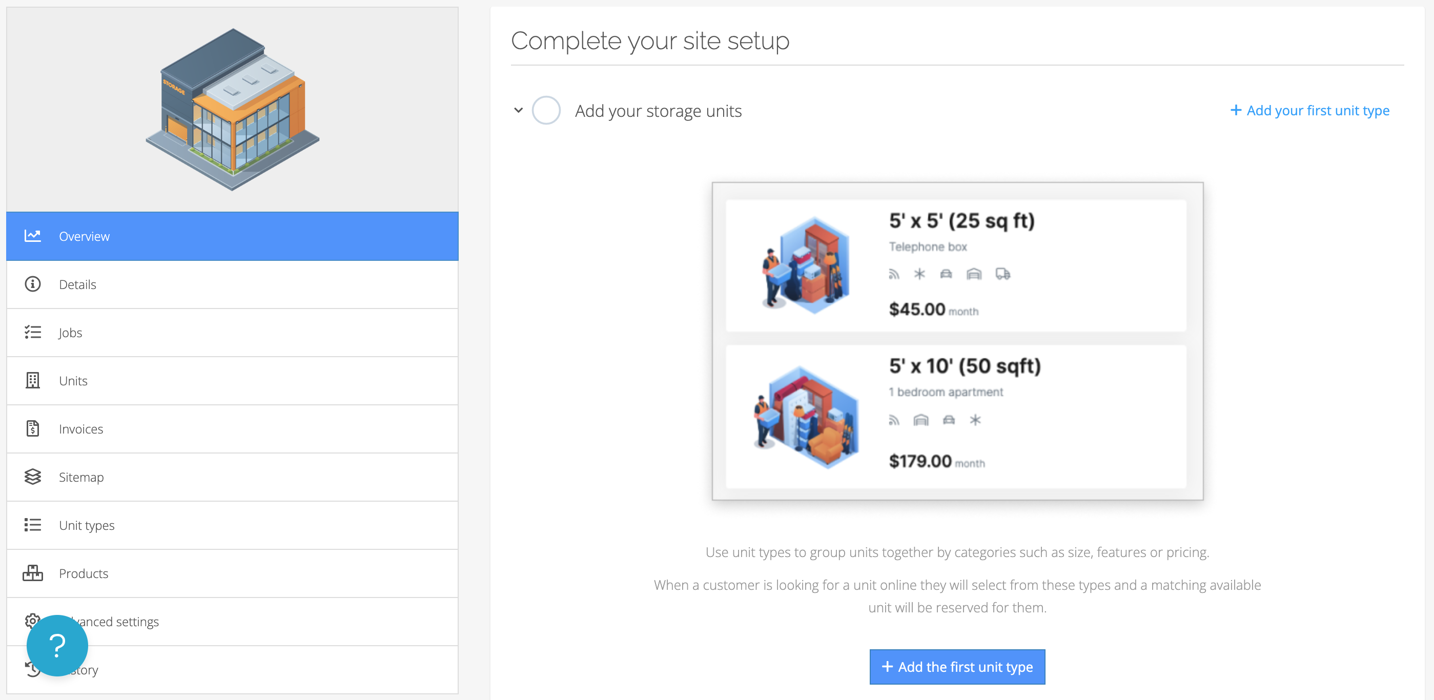 From the site Overview section you can follow the Complete your site setup walkthrough to get your first unit types and units added to your account. Click the ‘+ Add the first unit type’ button to begin this process.