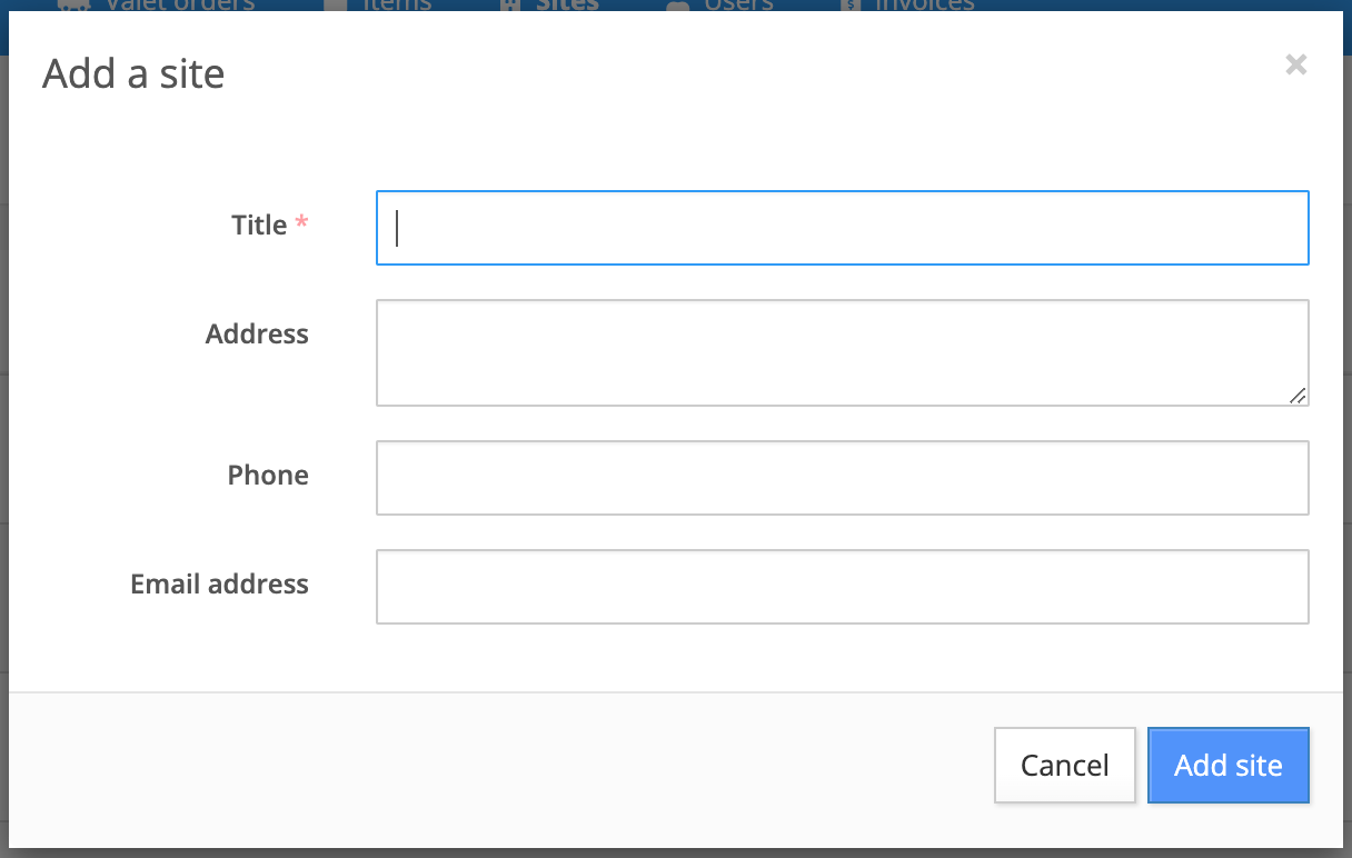 The first step in setting up your operation is to add your first site. To begin, click the + button on the right-hand side to open the ‘Add a site’ window where you can enter the initial basic details: Location title, Address, Phone number, and Email address. Once entered, this will create your first Site.