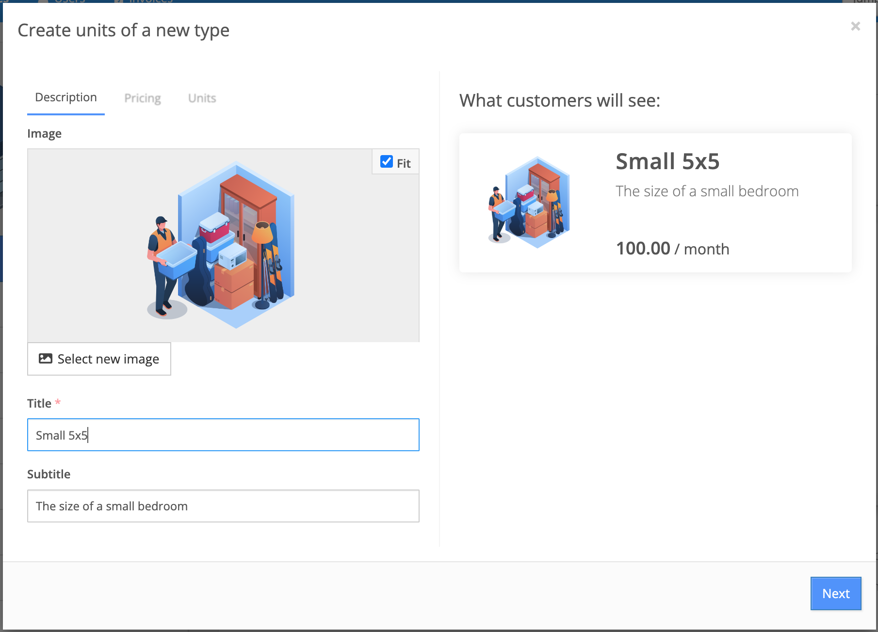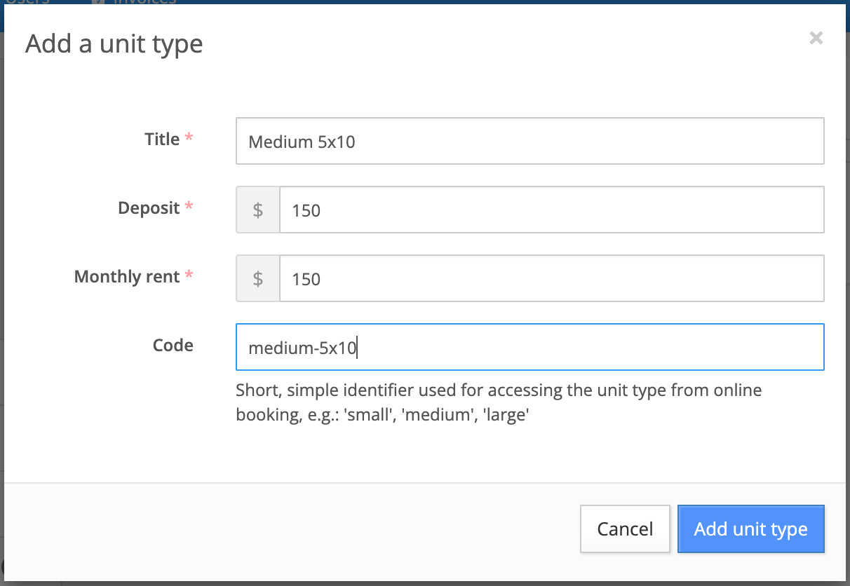 In the window that opens you will add the Title, Deposit, Monthly rent, and Code for this new Unit type. Code is essentially an internal identifier used when referencing this unit type. In the example image above, the code is the small italicized text 'small-5x5'.