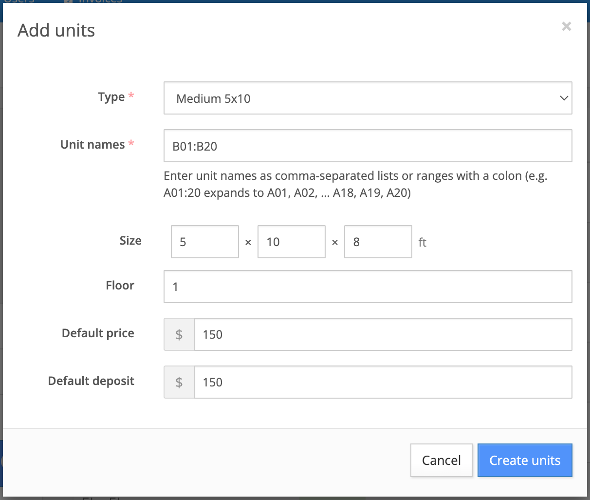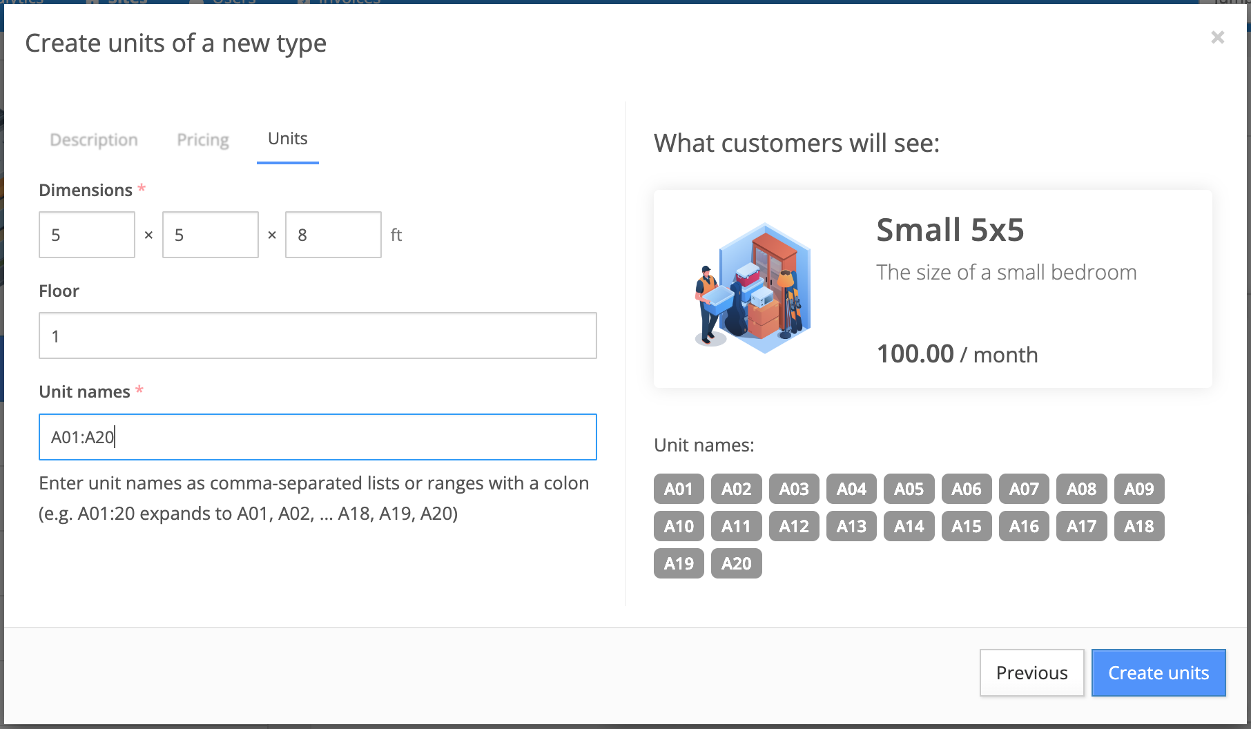 Click the 'Create units' button to create this new batch of units.Repeat these steps of creating unit types and units as needed to get your Storeganise account to accurately reflect your facility and the units you offer.You can find various articles with more information about units and unit settings here.