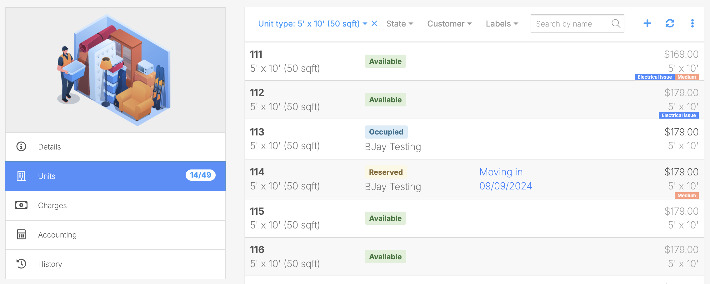 The Units section displays all units in your account of this unit type. You can also click the + button to create new units. Functionality for this section is identical to the main units section found in your site settings. Click here for more information.