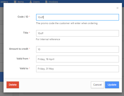 Use the Valid from and Valid to dates to limit the validity.Note: Valet promo codes only provide a numerical amount of credit. Percentage discounts or a number of free months are not supported.