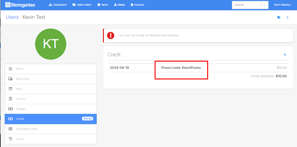 The promo code will be added to a user's account under the credit section once the collection job is completed (i.e. the items are in storage). Credit can be viewed in a User's details page under the Credit tab.