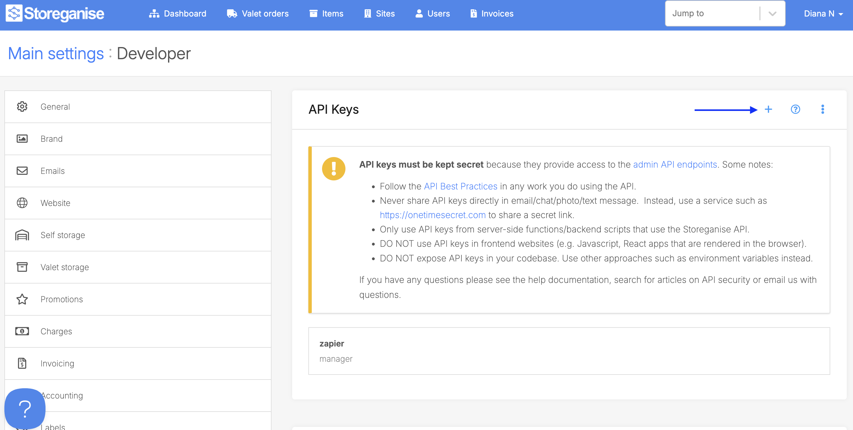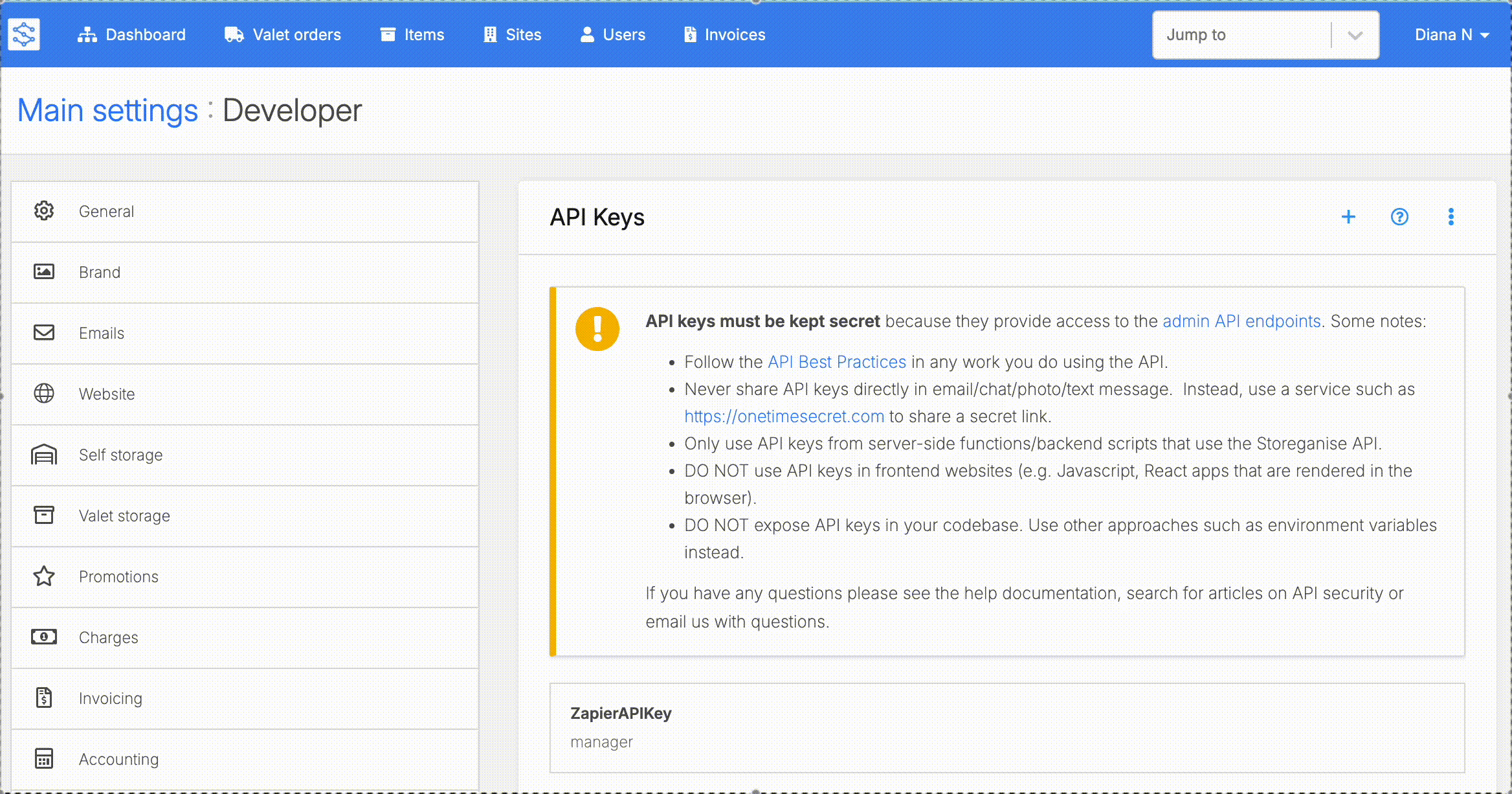 1. Within your Storeganise management portal, go to the "Main Settings" section. Find the "Developer" sub-menu on the left-hand side.