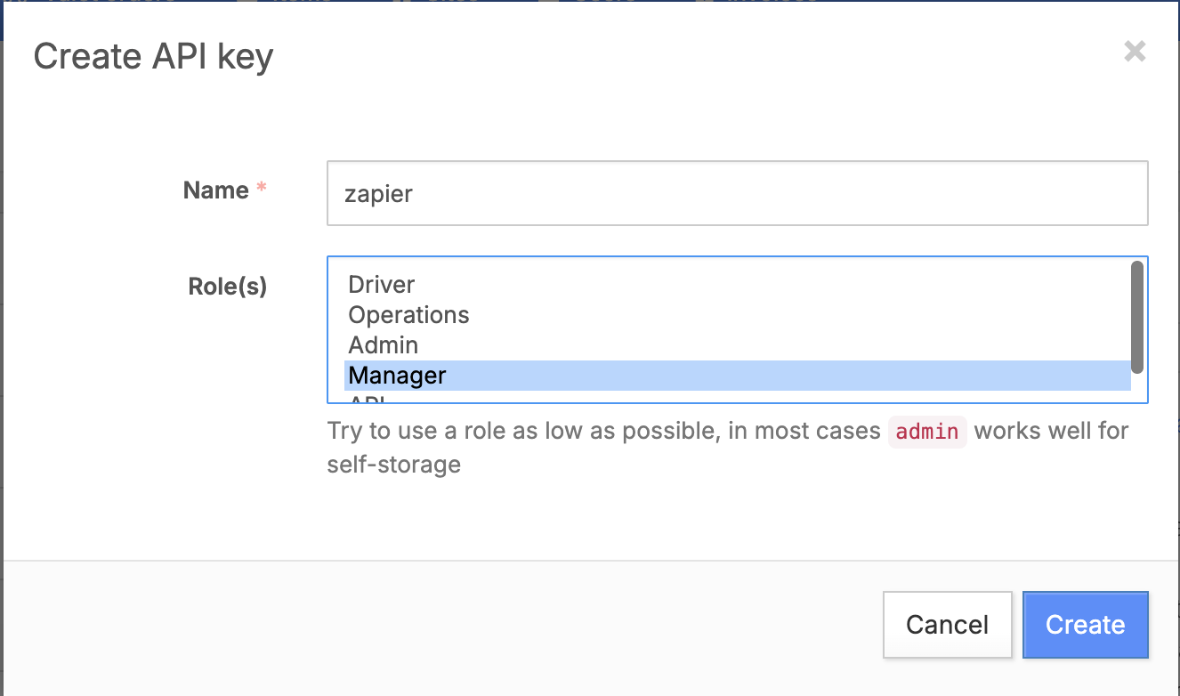 Important: You MUST select the Manager role. Any other role may result in the Zapier connection not working as expected. You can simply put the integration name "zapier", for example.