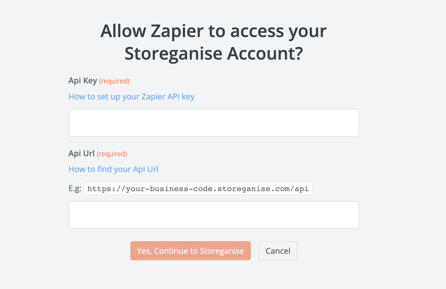4. Use your credentials to connect your Storeganise account to Zapier.