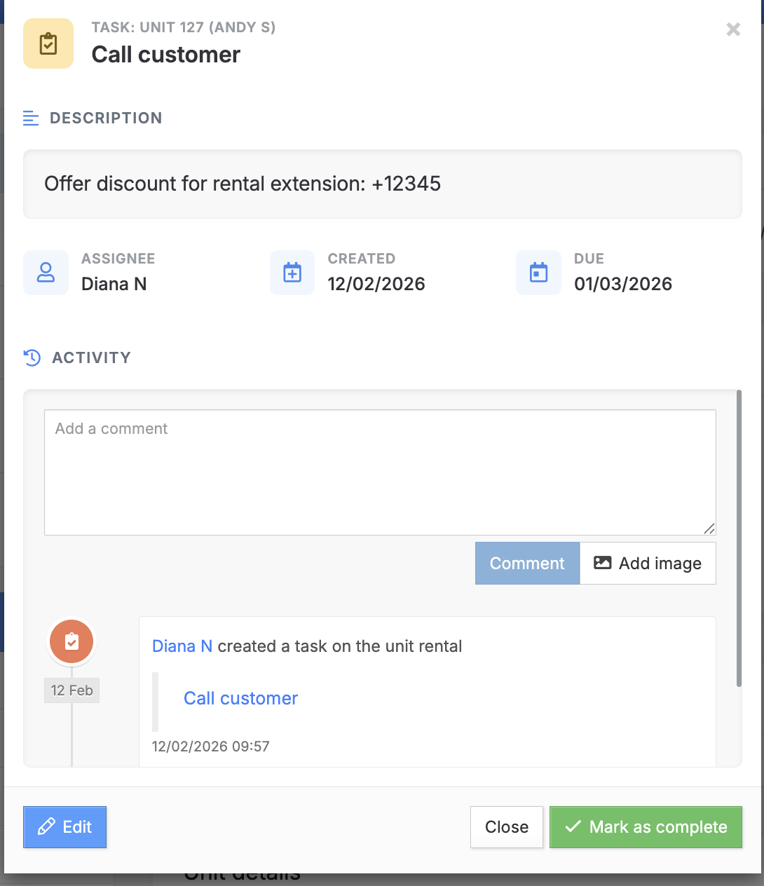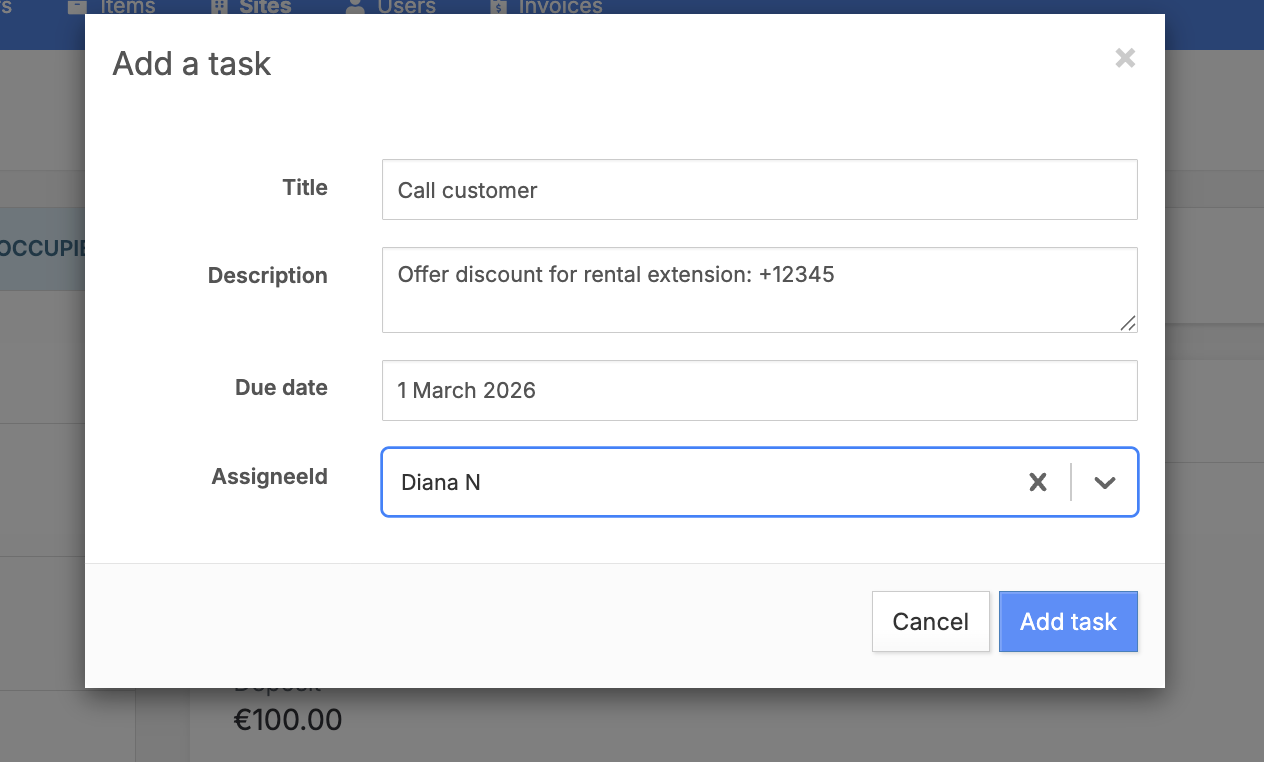 To create a task, go to Unit/Unit rentals in the management portal. Click Add task, then enter the task title and description. If needed, set a due date and select an admin user from the Assignee dropdown. Click Save to create the task.When you create a task from a unit/unit rental page, the system automatically associates the task with that unit.You can also create a task without selecting an assignee. Unassigned tasks still appear in task lists and can be assigned later.