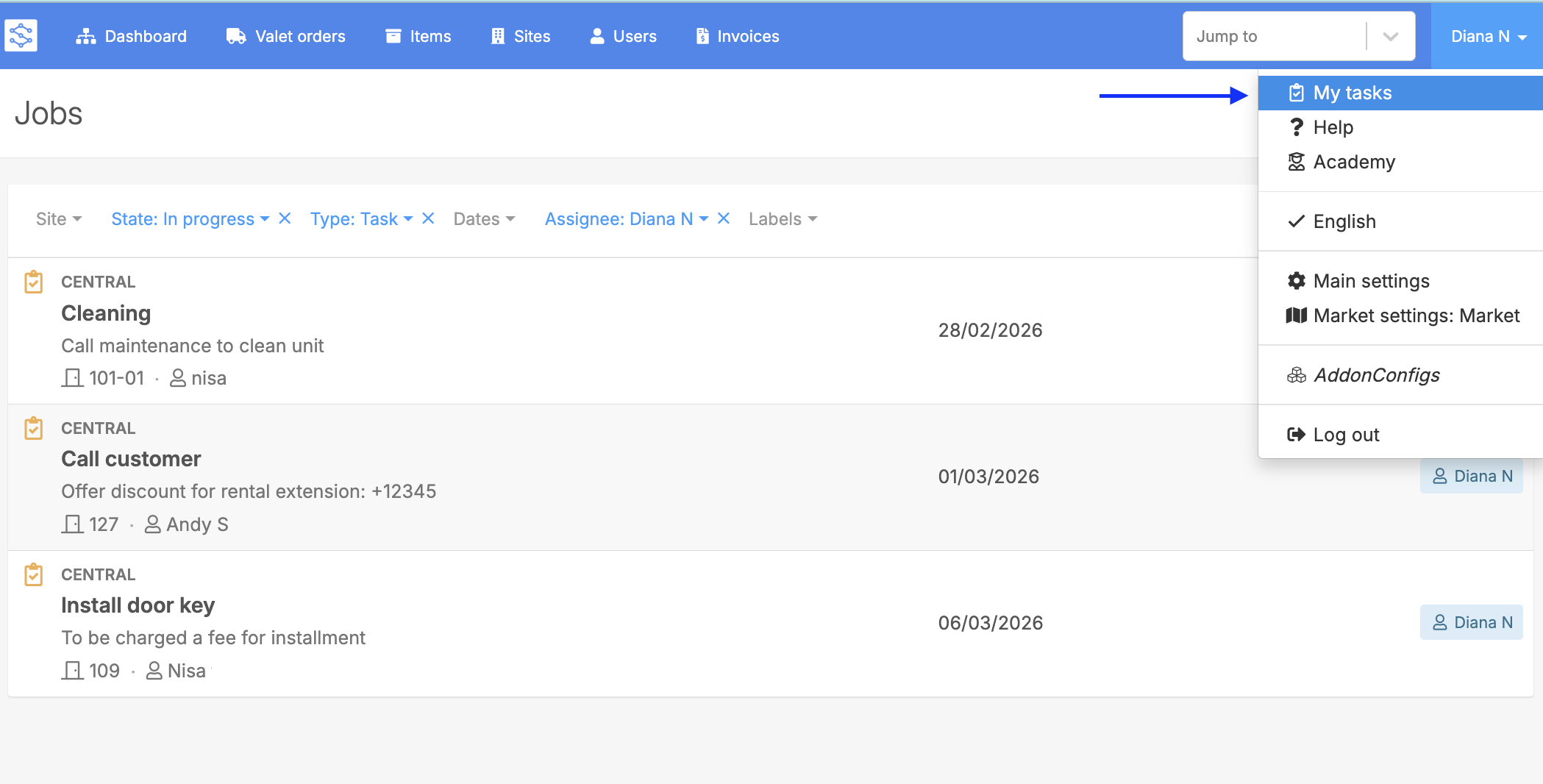 https://yourbusinesscode.storeganise.com/admin/jobs. This allows you to manage tasks across multiple locations while still being able to focus on a single site when necessary.Overdue tasks are visually highlighted in the task list, making it easy to identify and prioritize them.