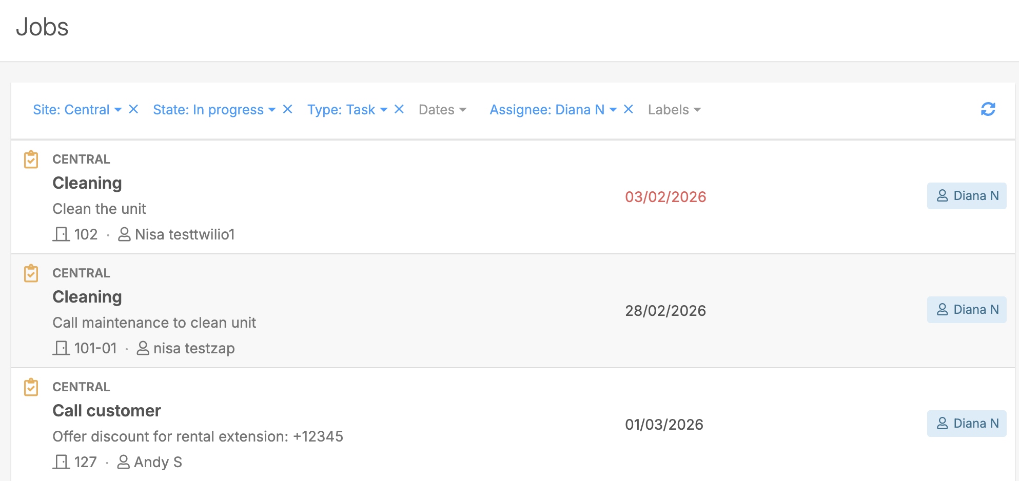 You can edit tasks after creating them. Open the task from the jobs list or from the unit page, then click Edit. Update the title, description, due date, or assignee as needed, and click Update task to apply your changes.If you change the assignee and save the task, the system automatically updates the assignment. The task will then appear in the new assignee’s My tasks view.